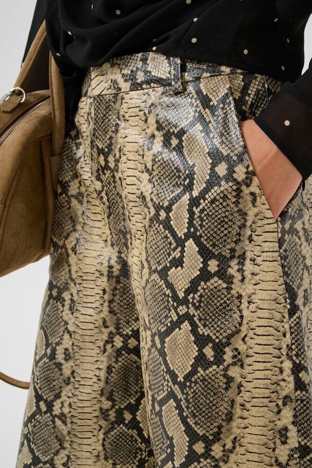 Shorts van Gestuz, gemaakt van lamsleer met een slangenprint in licht kaki en zwart. De shorts zijn knielang en hebben een hoge taille.