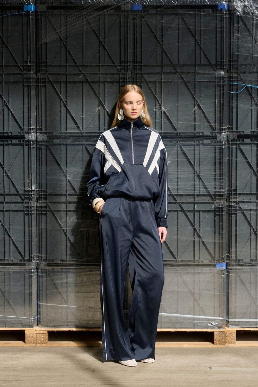 Anorak van Gestuz in donkerblauw met witte grafische strepen. Hij heeft een hoge kraag, een halve ritssluiting en elastische boorden.