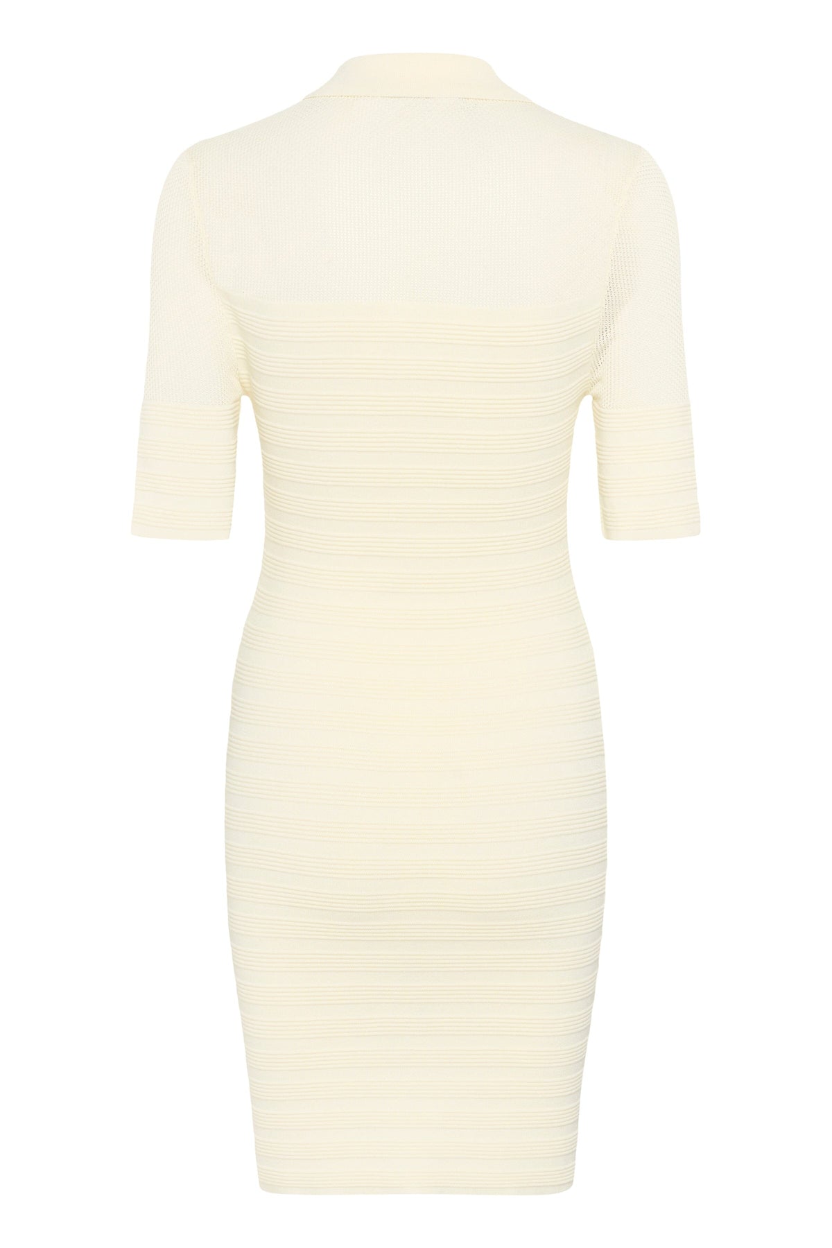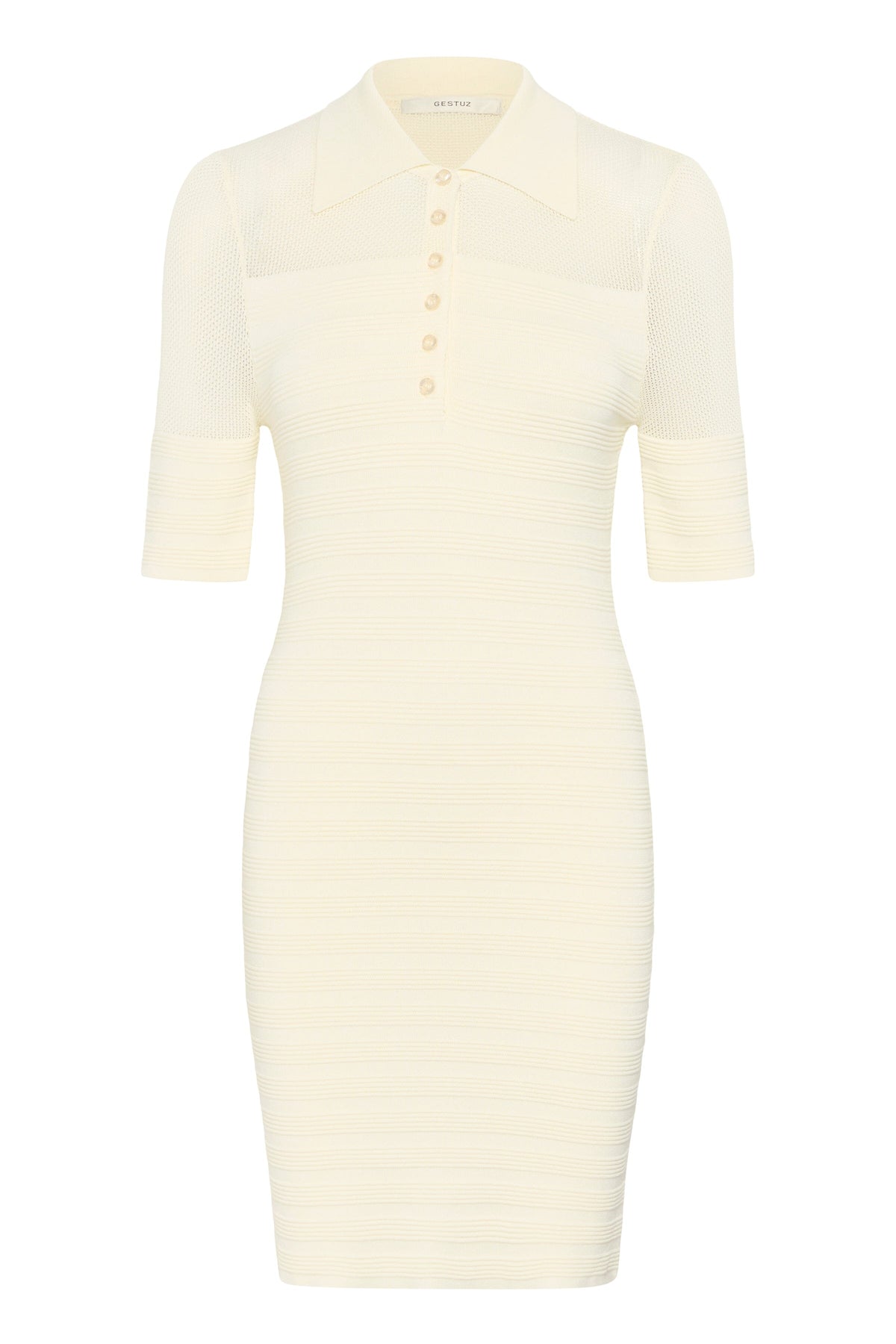 Jurk van Gestuz in een witte egret-tint. Het heeft een strakke pasvorm met 3/4 mouwen en decoratieve stiksels die een gestreepte textuur door de hele jurk creëren.