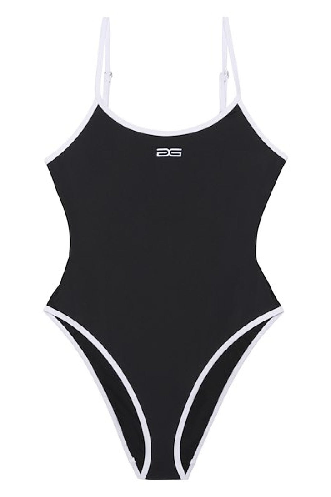 Zwarte badpak van Gestuz met witte contrastdetails. De hoge beenuitsnijding en de dunne bandjes creëren een sportieve stijl, terwijl de decoratieve stiksel fijne details toevoegt.