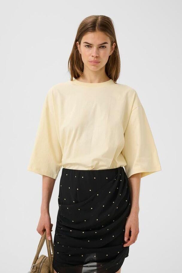 Lichtgele T-shirt van Gestuz, gemaakt van 100% biologisch katoen. De T-shirt heeft een geborduurd detail op de borst en een oversized pasvorm.