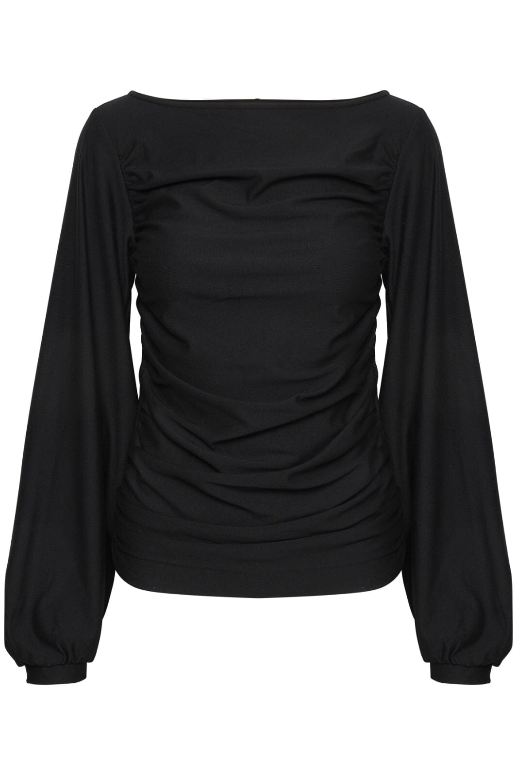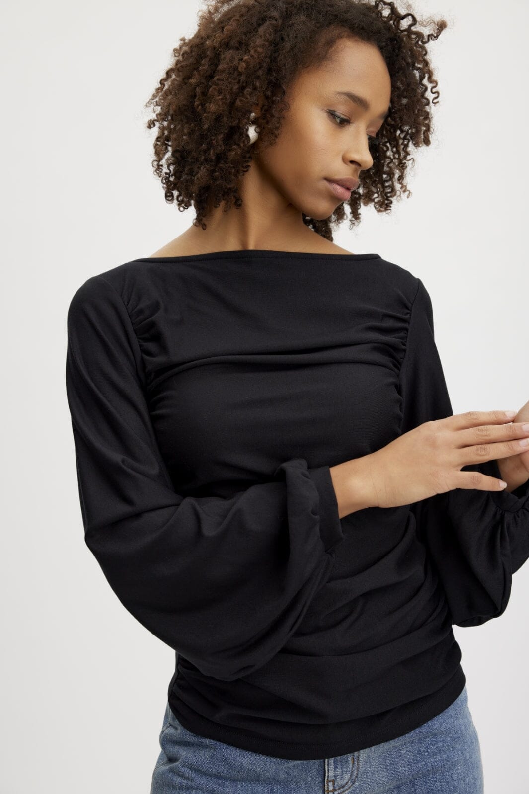 Zwarte blouse met ballonmouwen en vierkante halslijn. De blouse heeft een rimpel-effect aan de voorkant en elastiek bij de mouwen, wat zorgt voor een goede pasvorm.