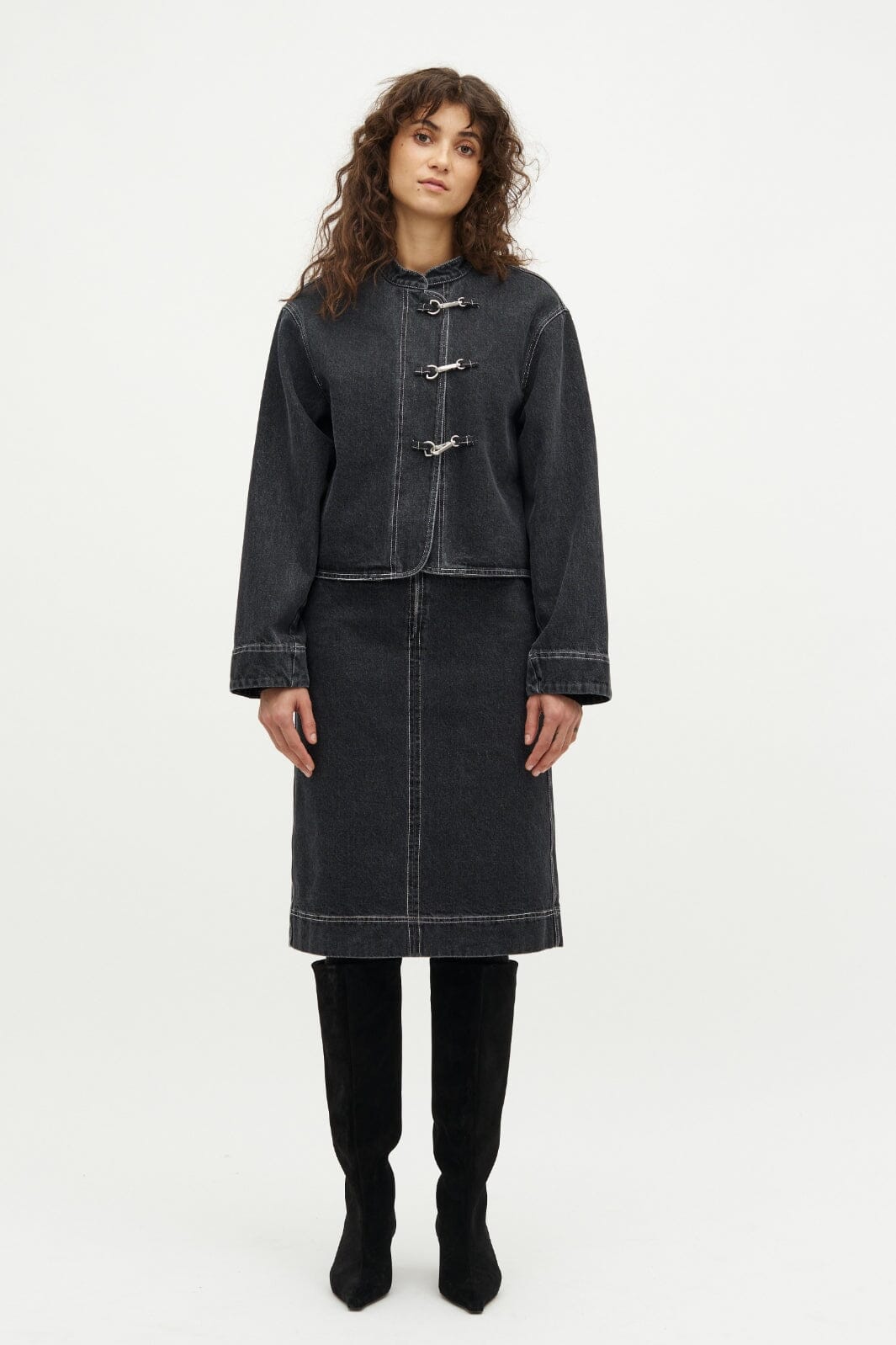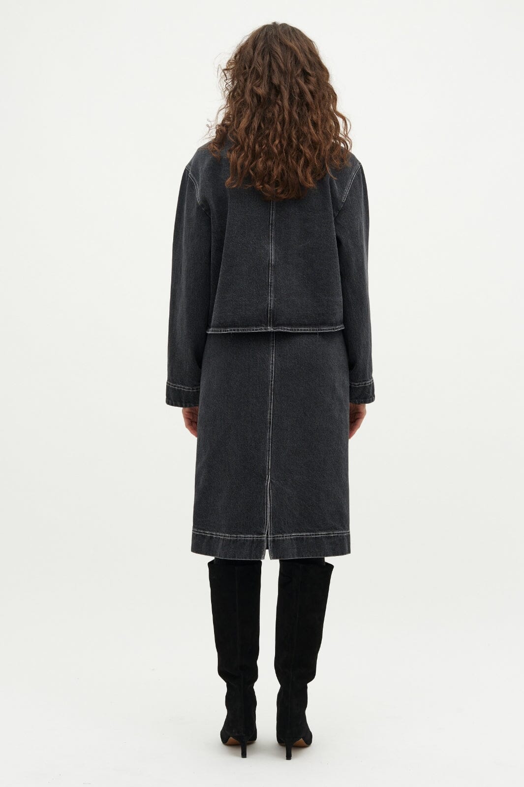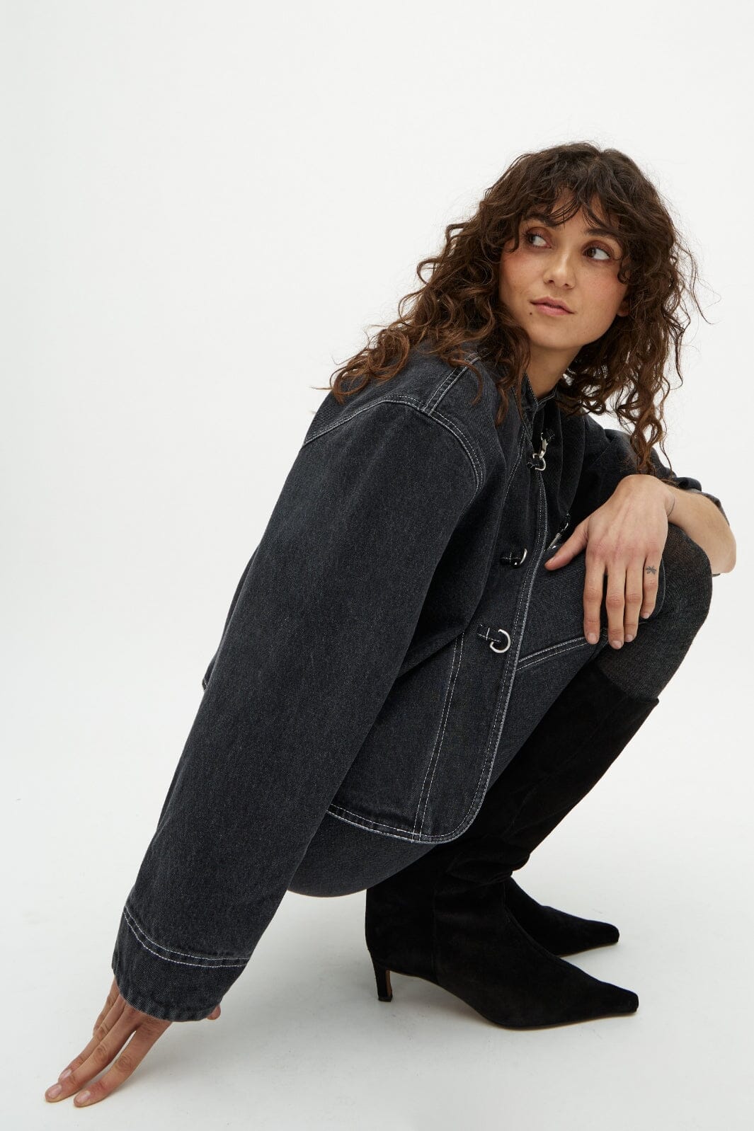 Grijze jas van Global Funk gemaakt van katoen. De jas heeft drie metalen sluitingen aan de voorkant en een hoge kraag.