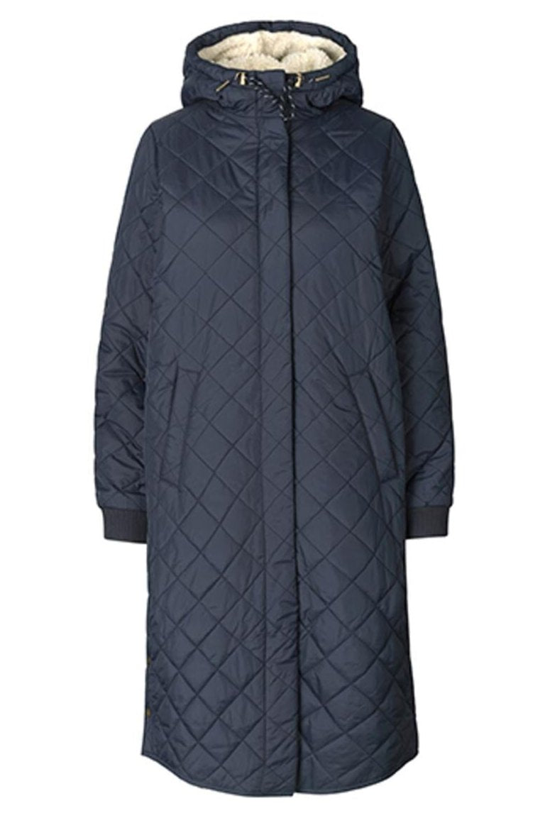 Knielange gewatteerde jas van Global Funk in donkerblauw. Ontworpen met hoge kraag, capuchon en een doorlopend ruitpatroon op het oppervlak. Ribben aan de mouwen zorgen voor een goede pasvorm.