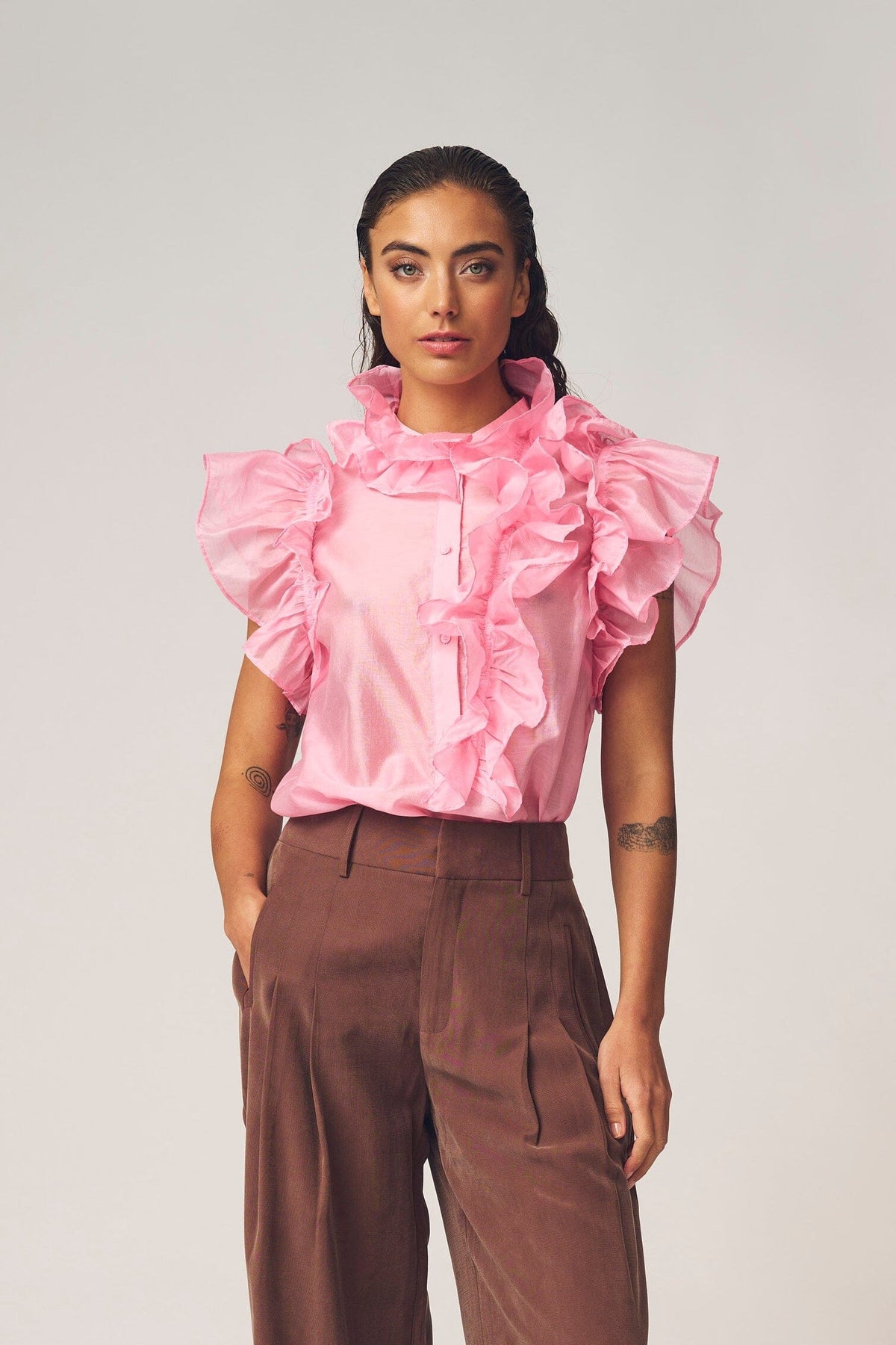 Roze blouse van Gossia, gemaakt van 90% lyocell en 10% polyester. De blouse heeft opvallende ruches langs de voorkant en schouders.