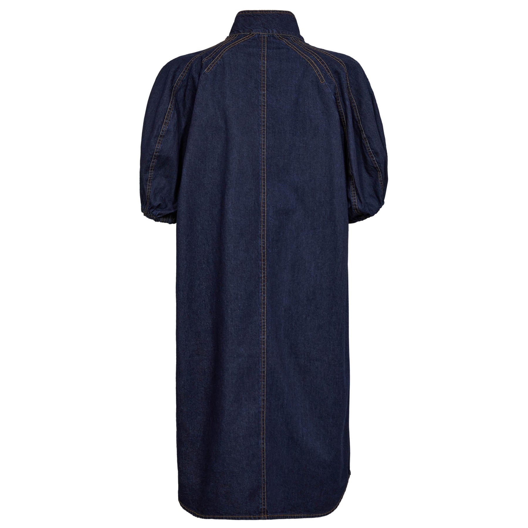 Een denimblauwe jurk van Gossia met decoratieve stiksels en ruches. De jurk heeft een hoge kraag met knoopdetails en korte, puffige mouwen.