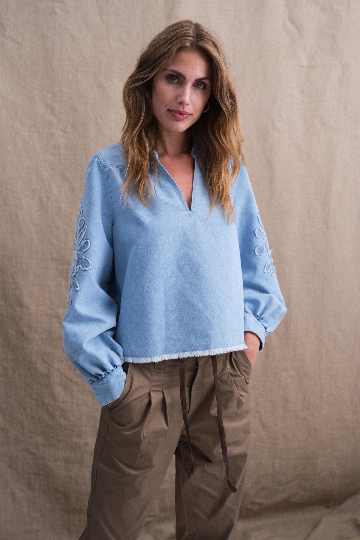 Blouse van Gossia in lichtblauwe denim. De blouse heeft geborduurde bloemdetails op de mouwen en een V-hals met franjes aan de onderkant.