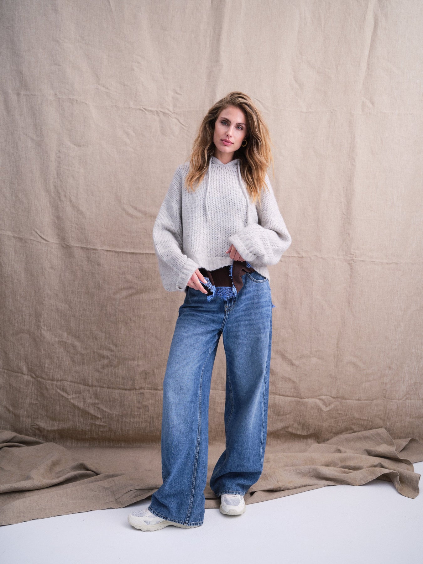 Hoodie-trui van Gossia in lichtgrijs gemêleerde kleur met gebreide textuur en capuchon met trekkoord.