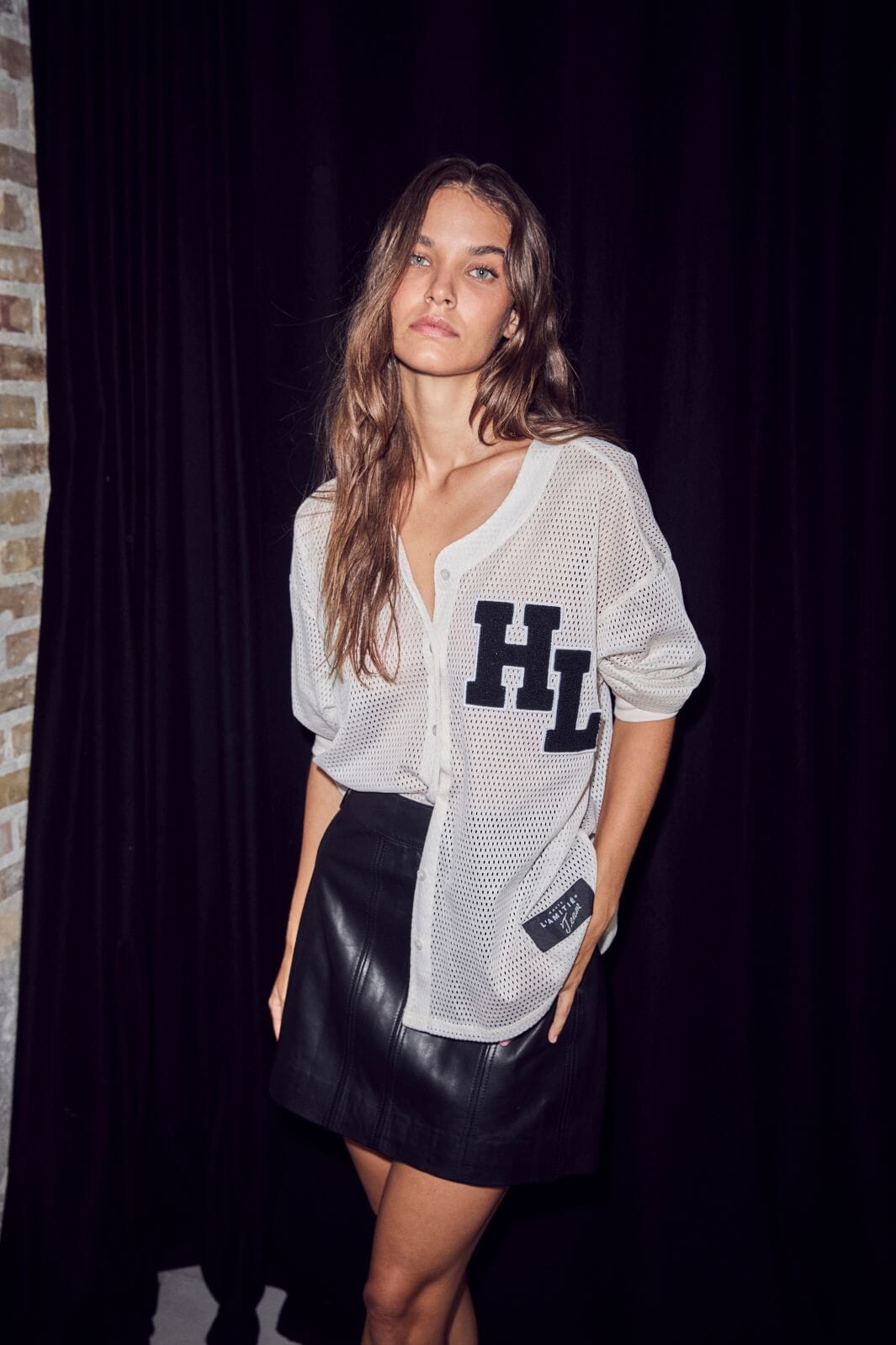 Blouse van Haute L'Amitié in een witte parelmoertint. De blouse is gemaakt van een mesh-achtig materiaal met zwarte HL-letters op de linkerborst.