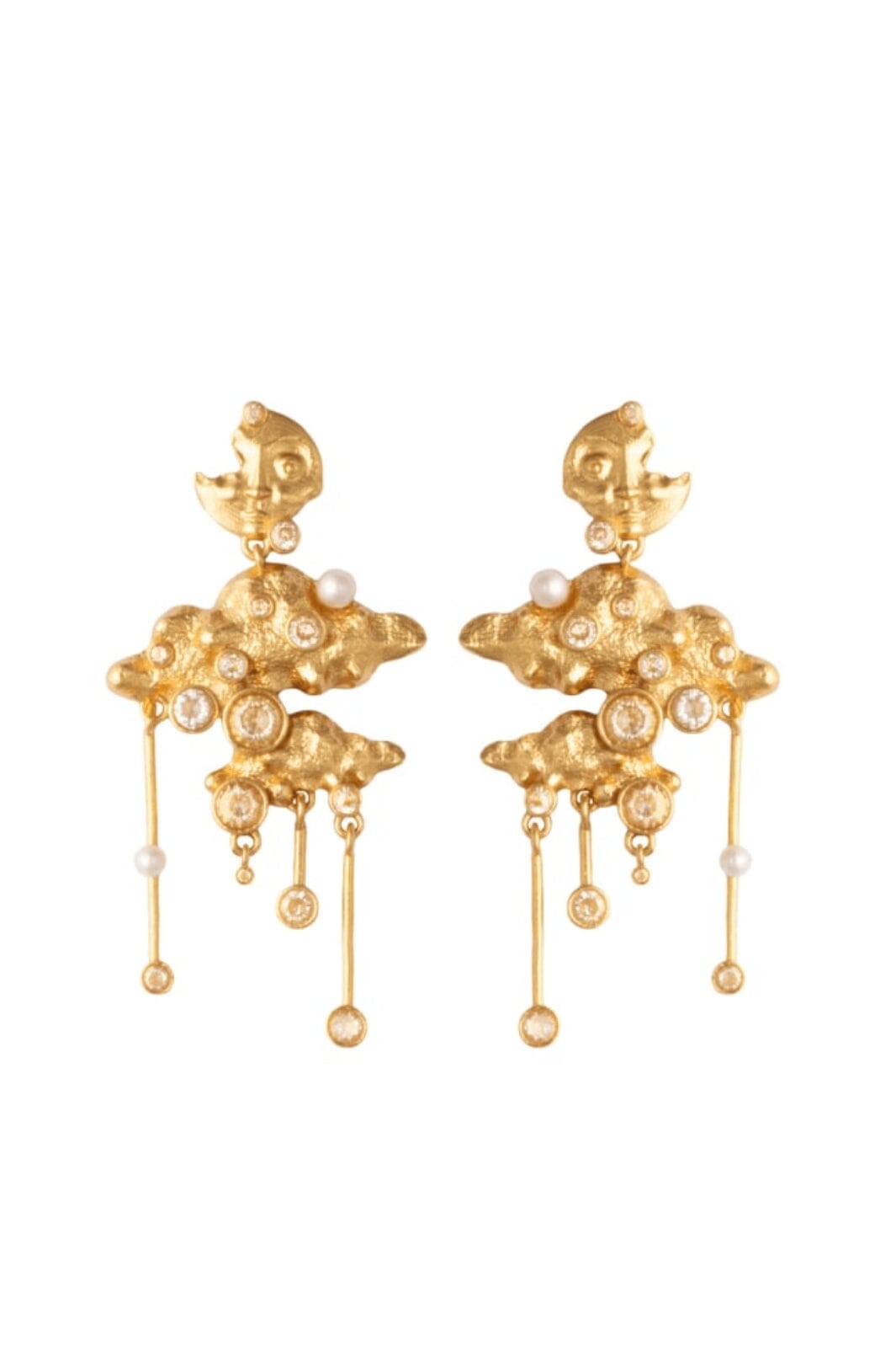 Gouden oorbellen van House of Vincent met wolkinspiratie ontwerp. De oorbellen hebben pareldetails en zwevende elementen die een artistieke uitstraling creëren.