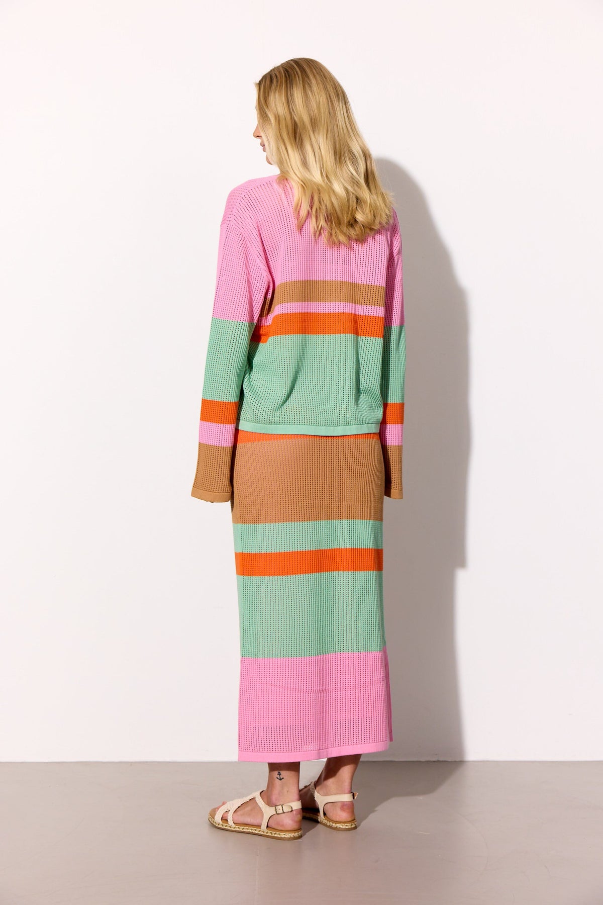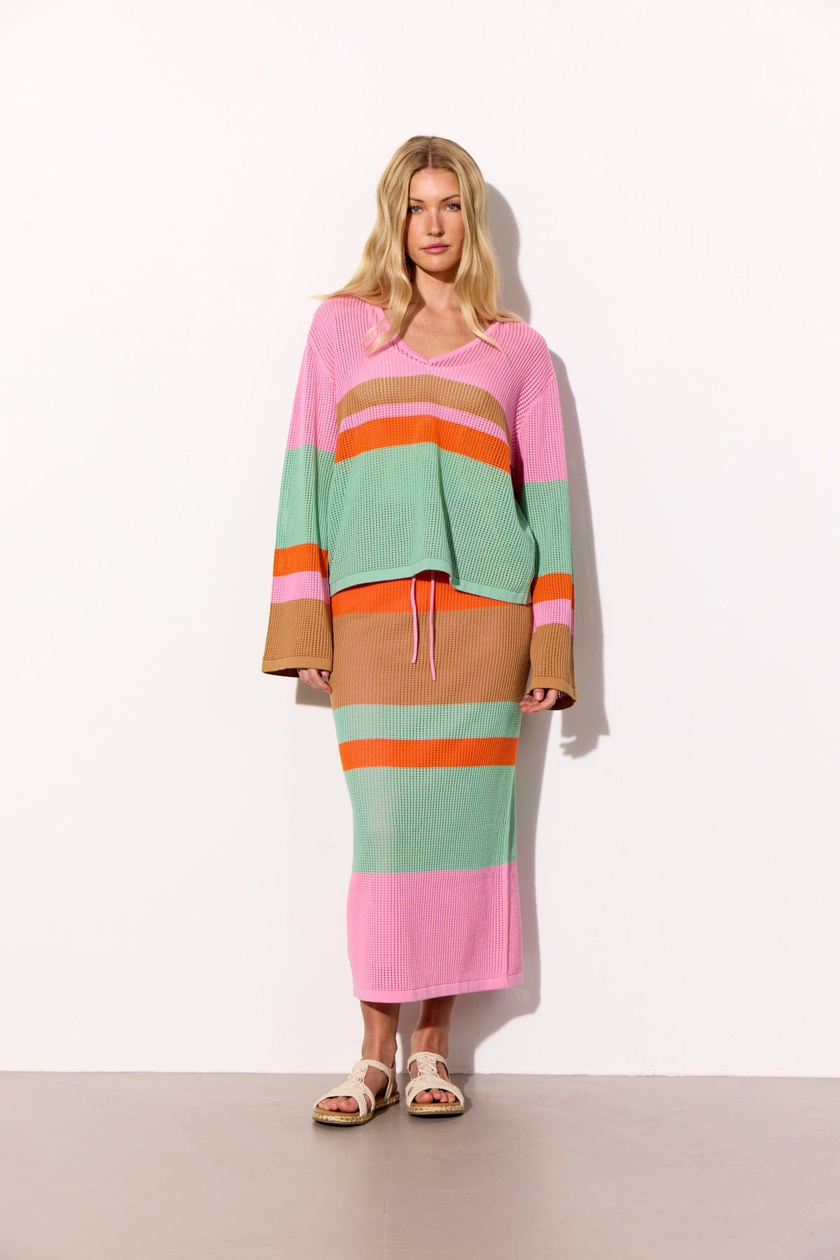 Blouse van Hunkøn met strepen in roze, mintgroen, oranje en bruin. De blouse heeft een meshgebreide structuur en een losse pasvorm.