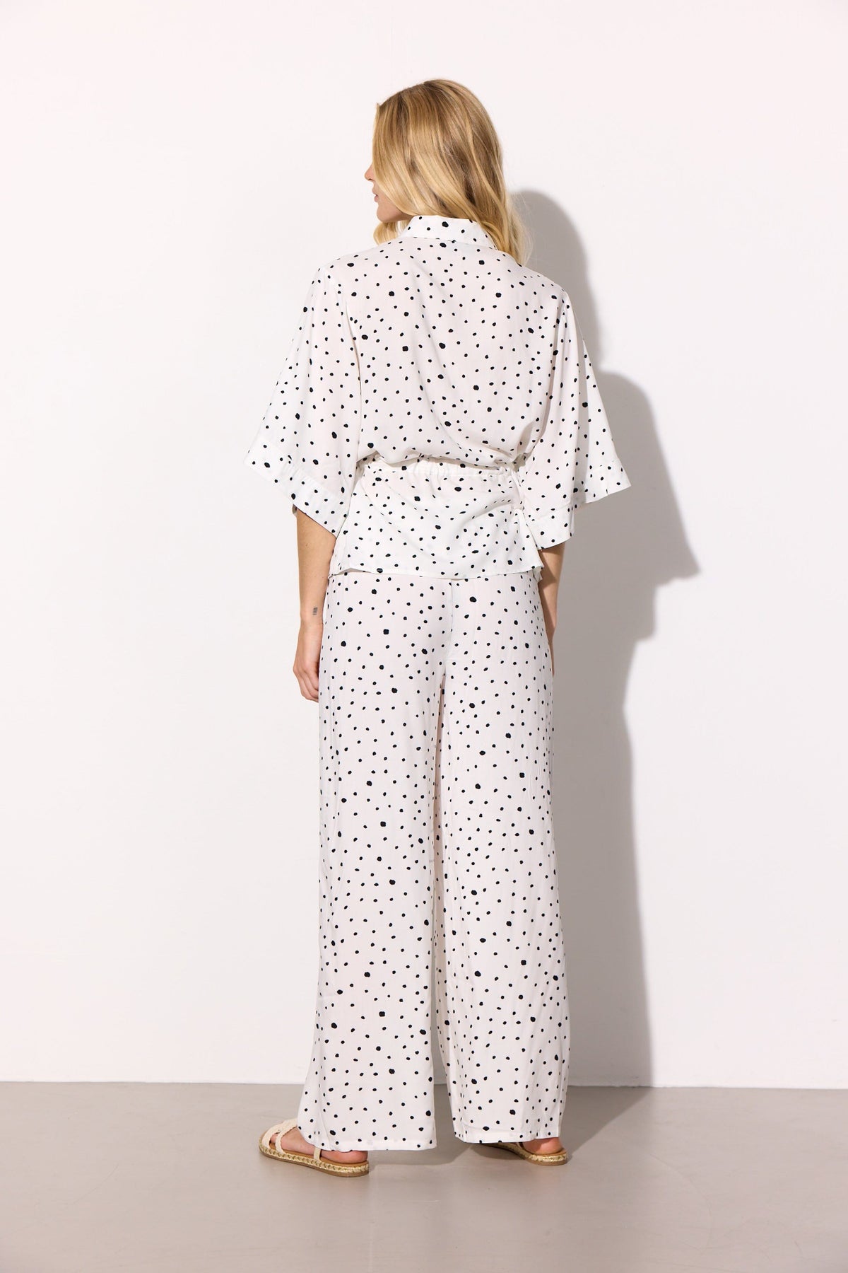 Witte broek van Hunkøn met zwarte stippen. De broek heeft een losse pasvorm en is gemaakt van zachte viscose stof.