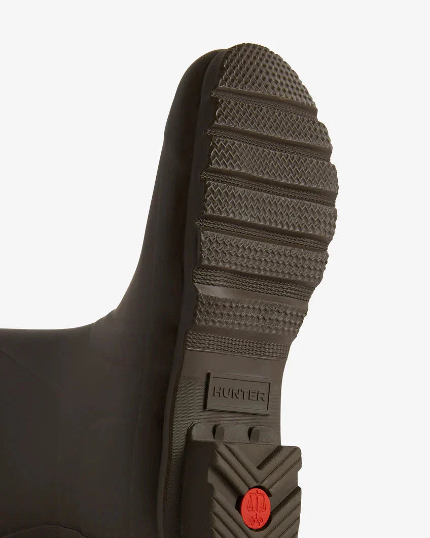 Hoge rubberlaarzen van Hunter in een chocoladebruine kleur. De laarzen zijn gemaakt van rubber en hebben een klassieke vorm met ronde neus.