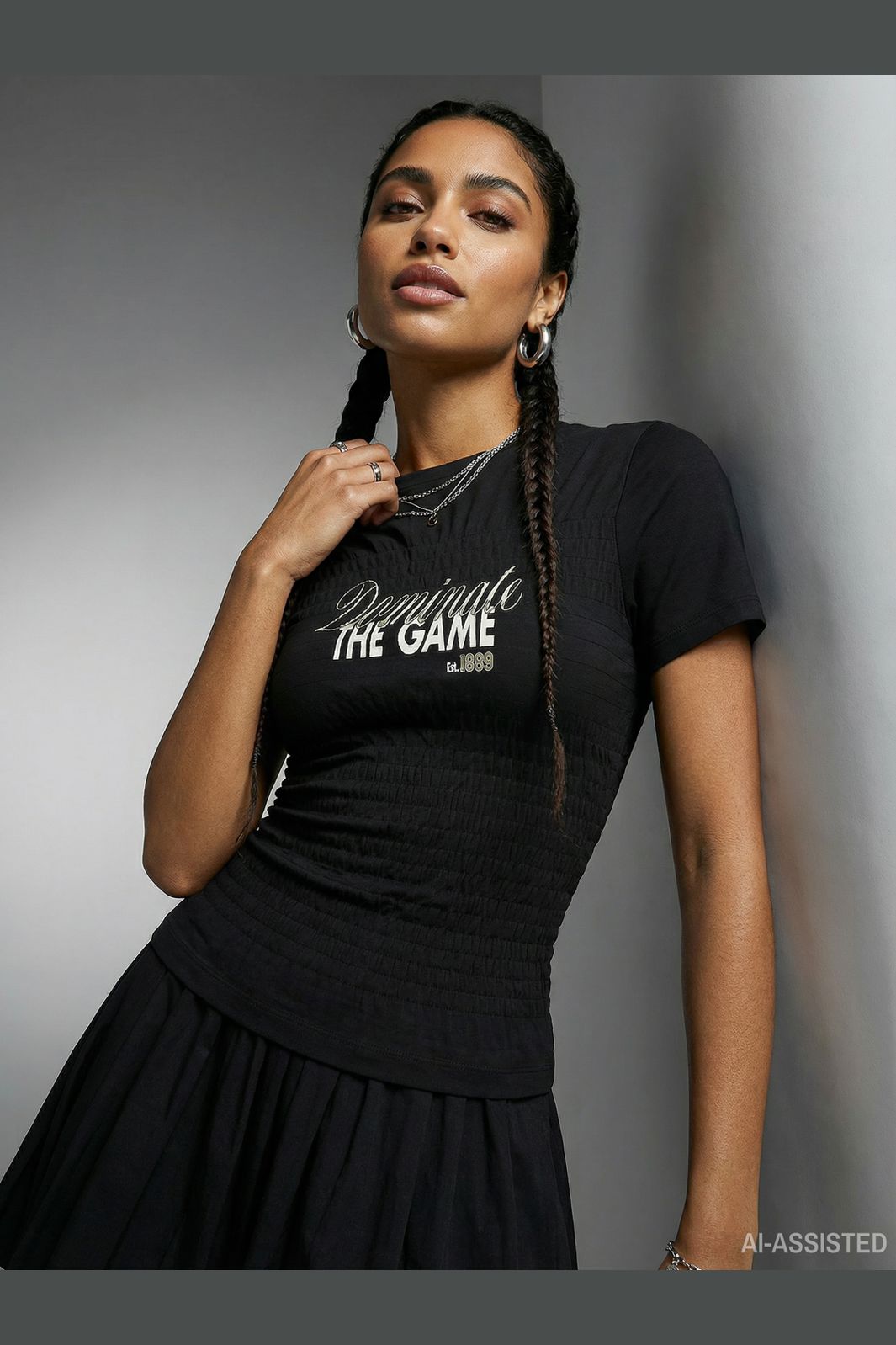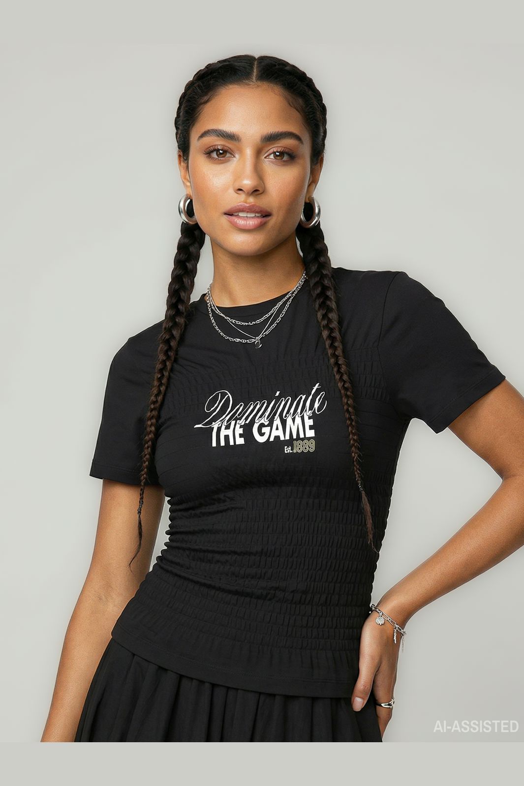 Zwart topje van Hypedrop met korte mouwen en print op de voorkant. De top heeft een smockdetail langs de taille en een aansluitende pasvorm.