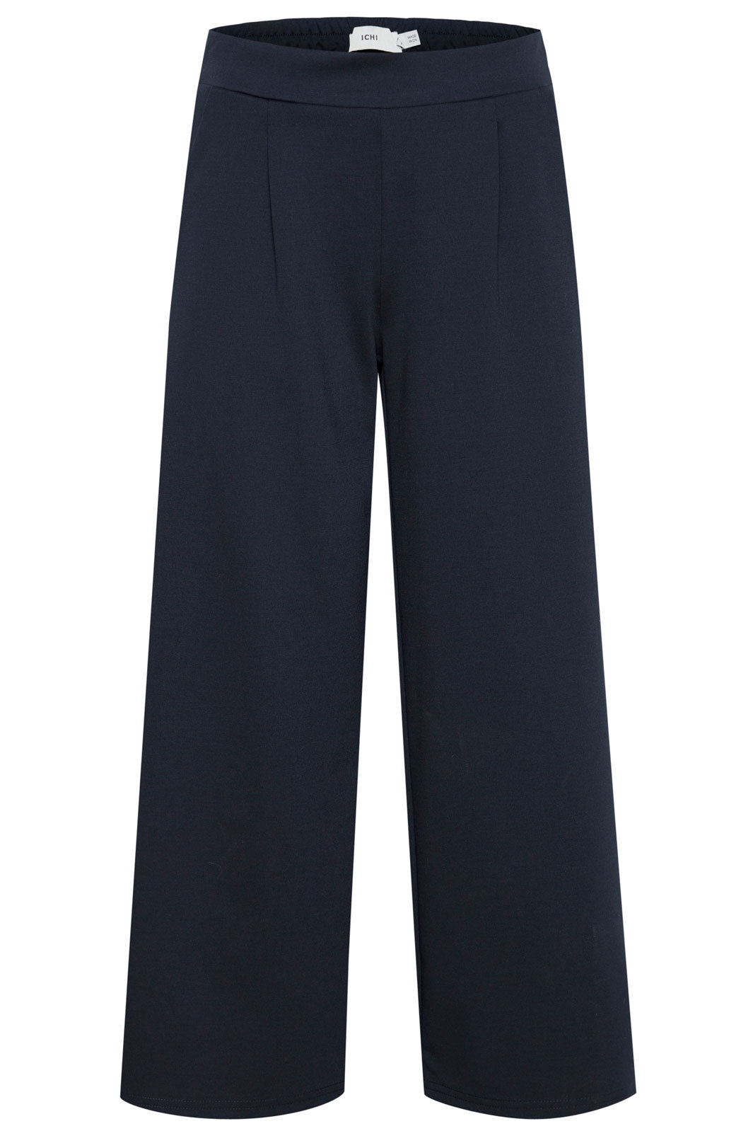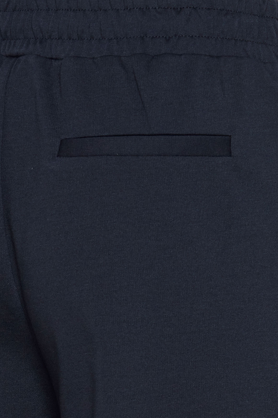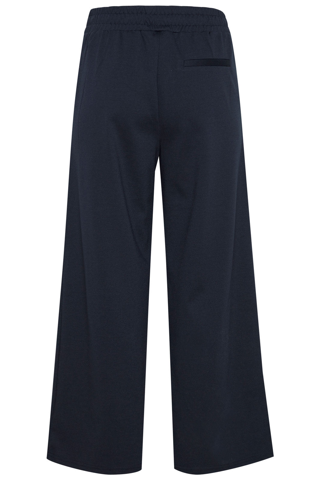 Jersey pants i mørkeblå fra Ichi med vidde i benene, side lommer, fast linning fortil og elastil i linning bagtil.