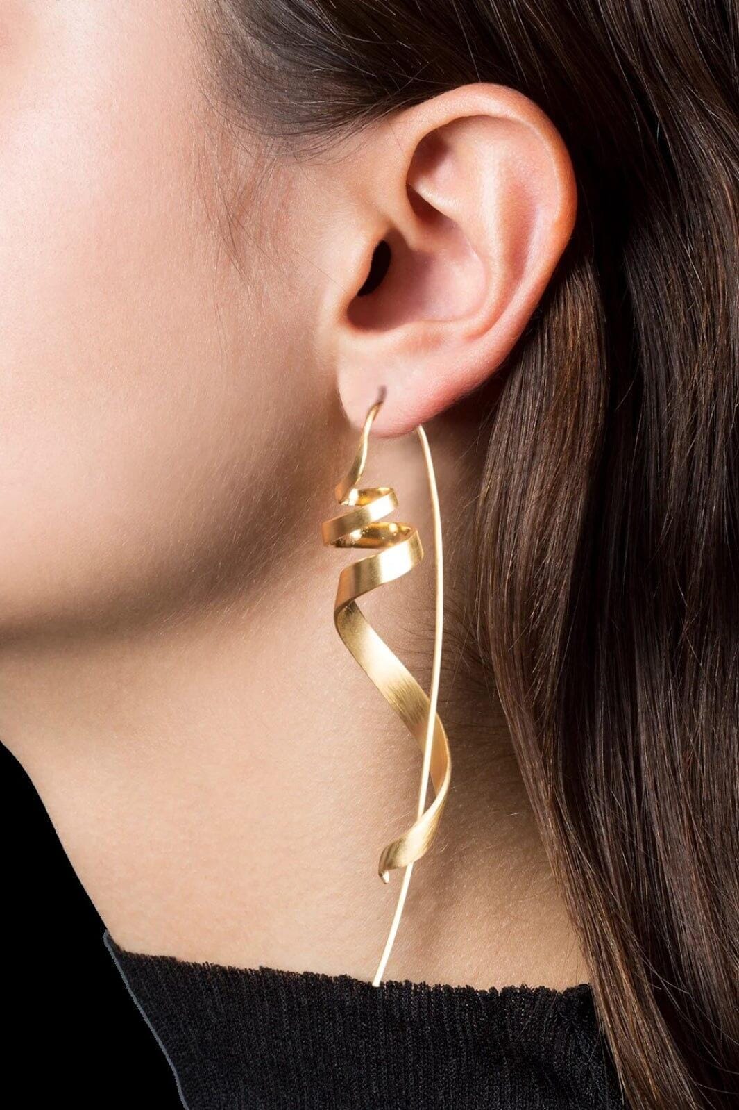 Vergulde oorbel met gedraaid ontwerp. De sculpturale vorm is gemaakt van 925 sterling zilver met een gouden afwerking. De oorbel heeft een lange, gebogen vorm.