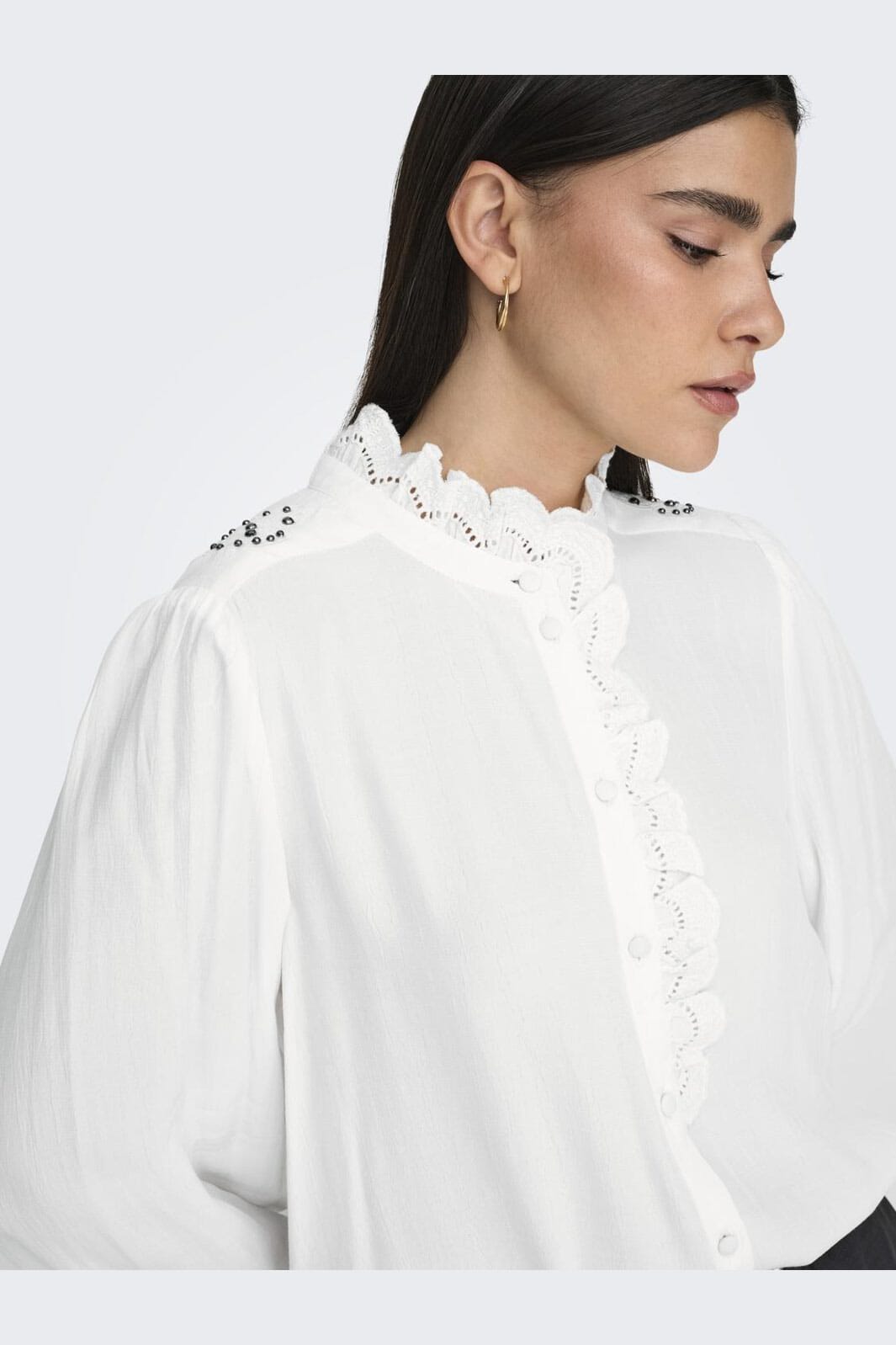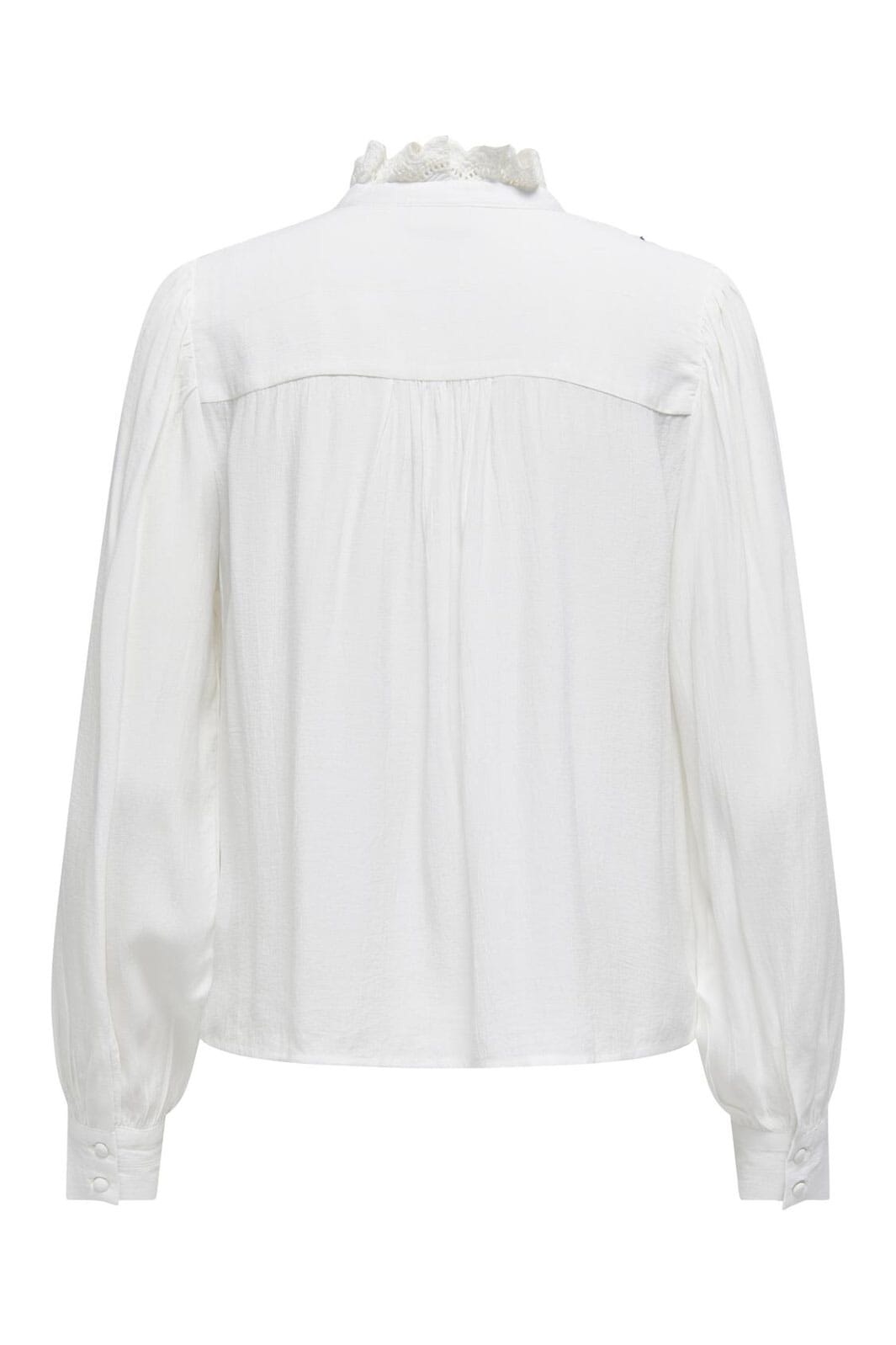 Witte blouse van JDY met ruches en kanten details. De blouse heeft lange mouwen met volume en een klassieke blousekraag met een gerimpelde rand. De knopen aan de voorkant maken het makkelijk om aan te trekken.