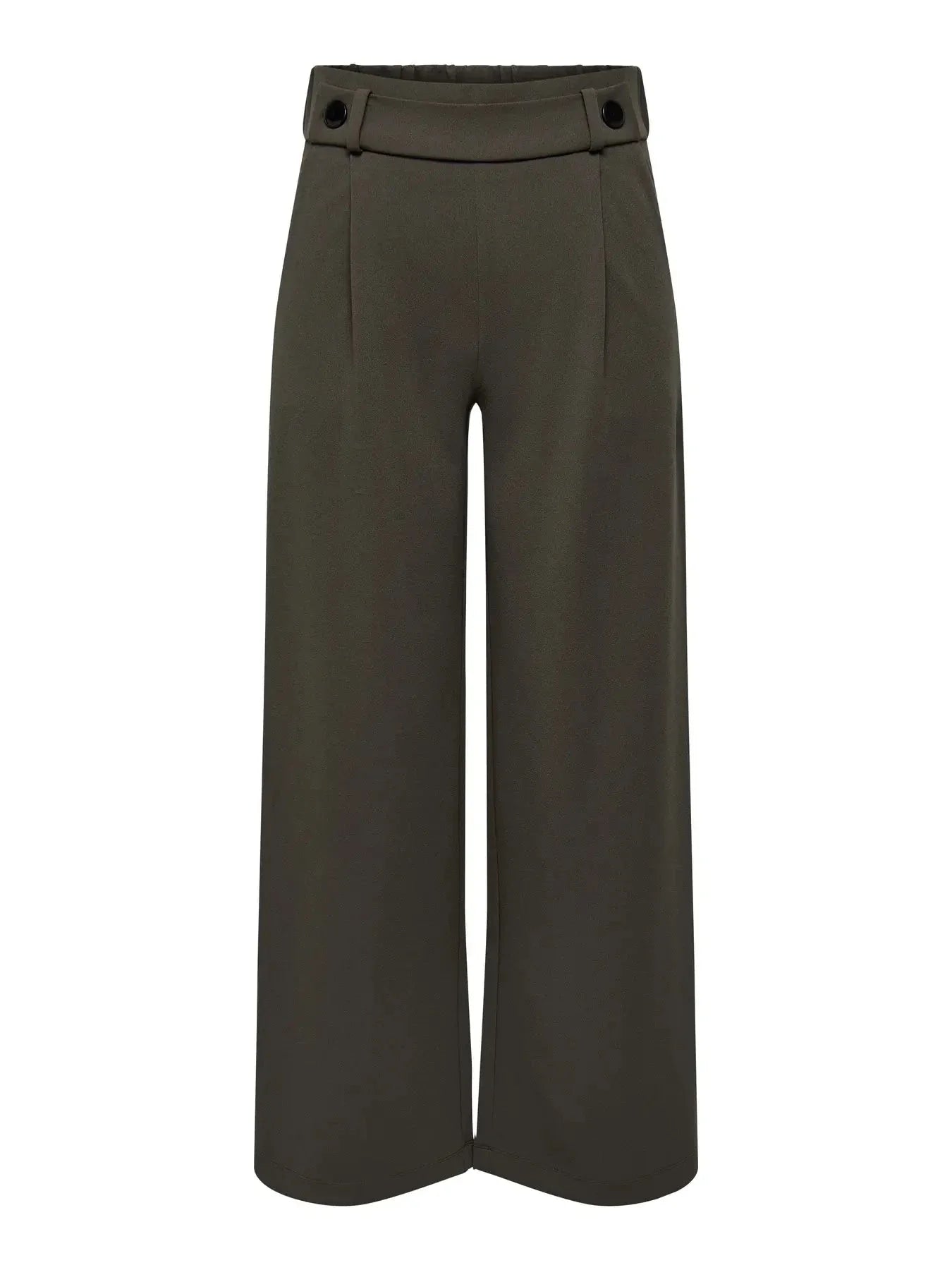 Chocoladebruine broek van JDY met zwarte knopen. De broek heeft een losse pasvorm met wijde pijpen en een hoge taille.