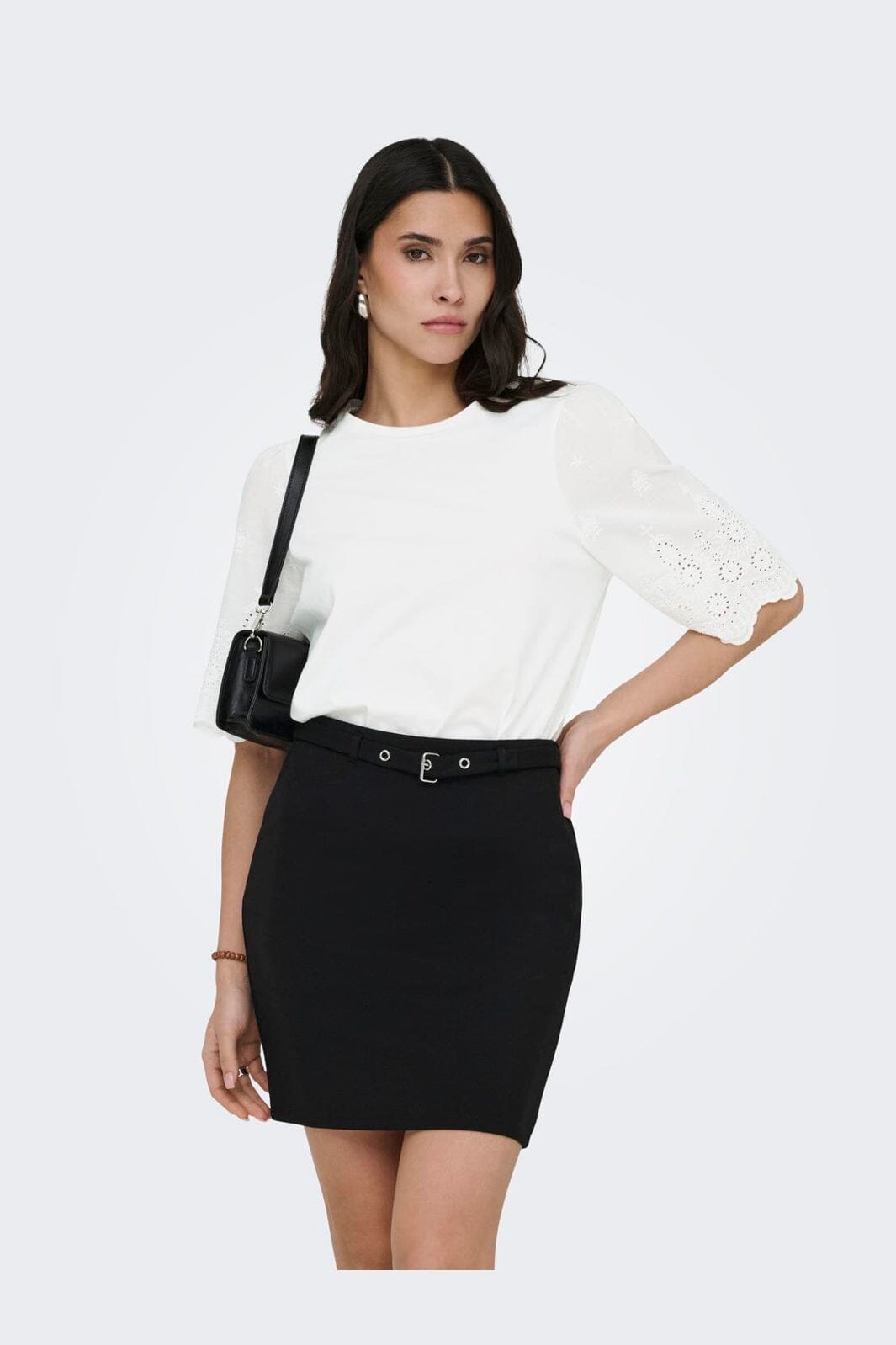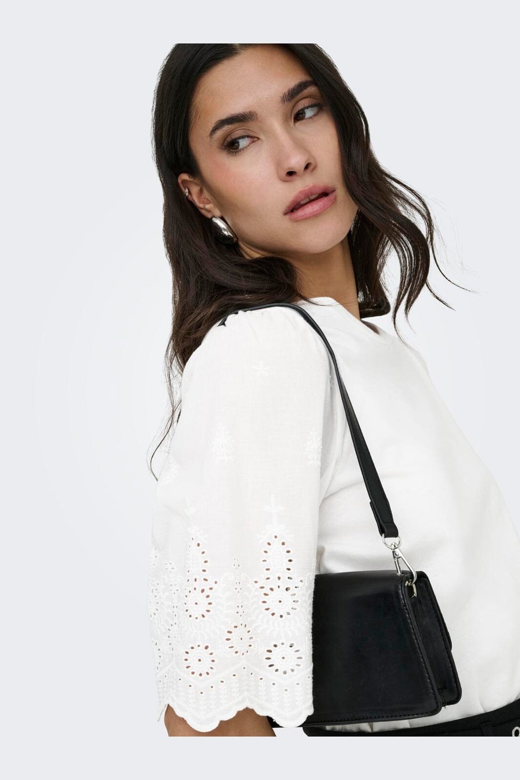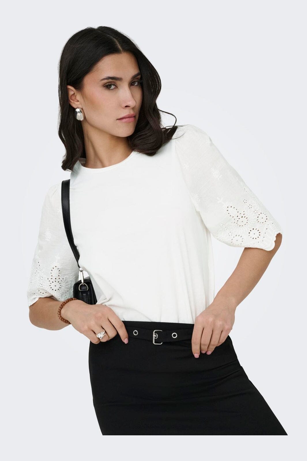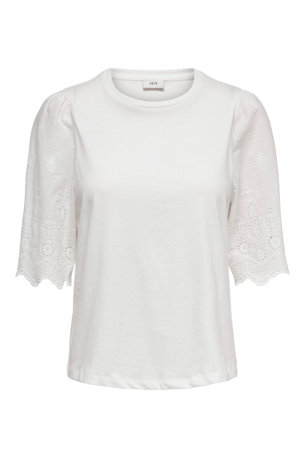 Witte top van JDY, gemaakt van biologisch katoen. De top heeft korte mouwen met geborduurde details en een ronde halslijn.