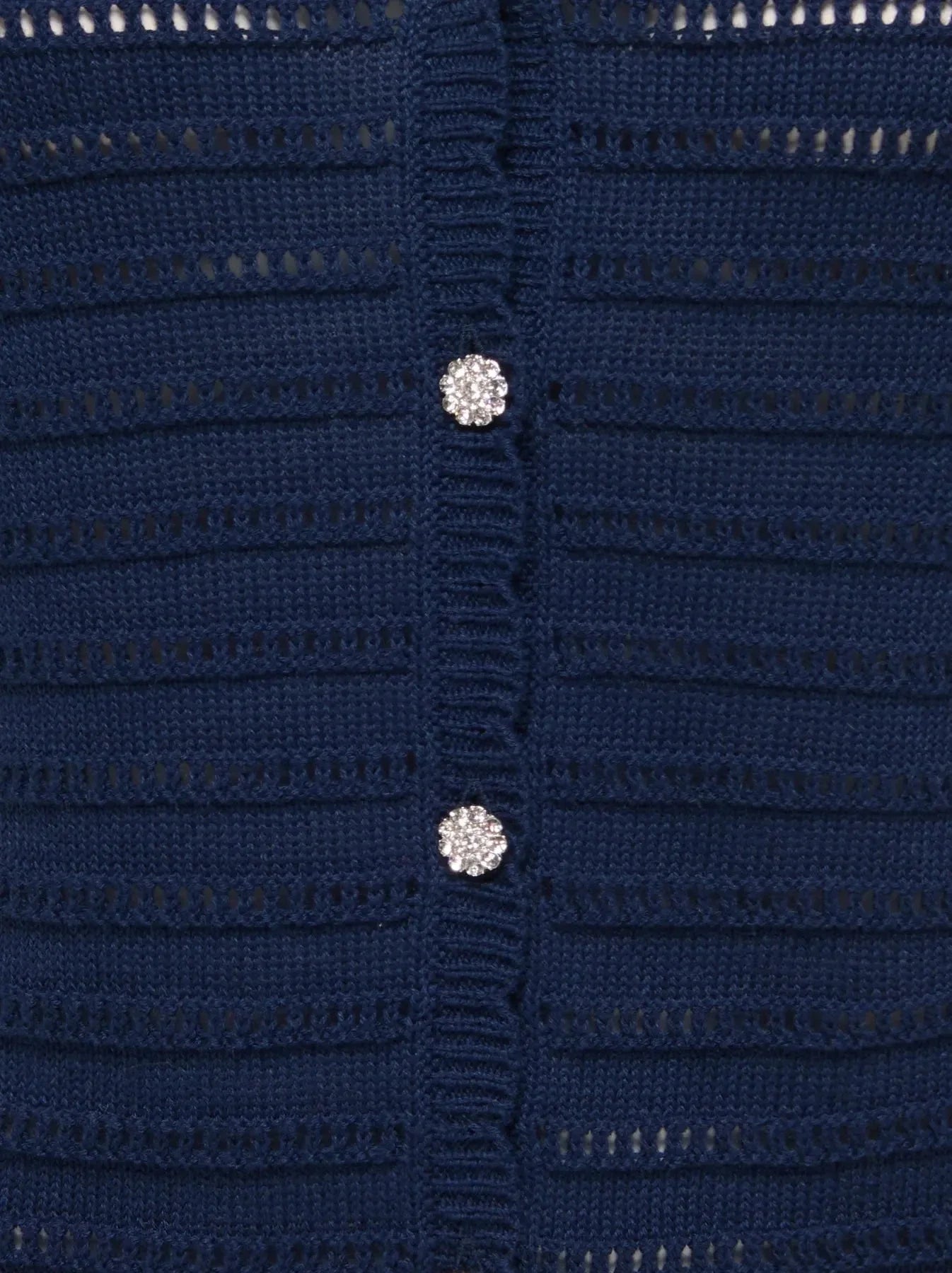 Een donkerblauw vest van JDY met een opengebreid patroon en korte mouwen. De V-hals en de glinsterende knopen geven het vest een vrouwelijke uitstraling.