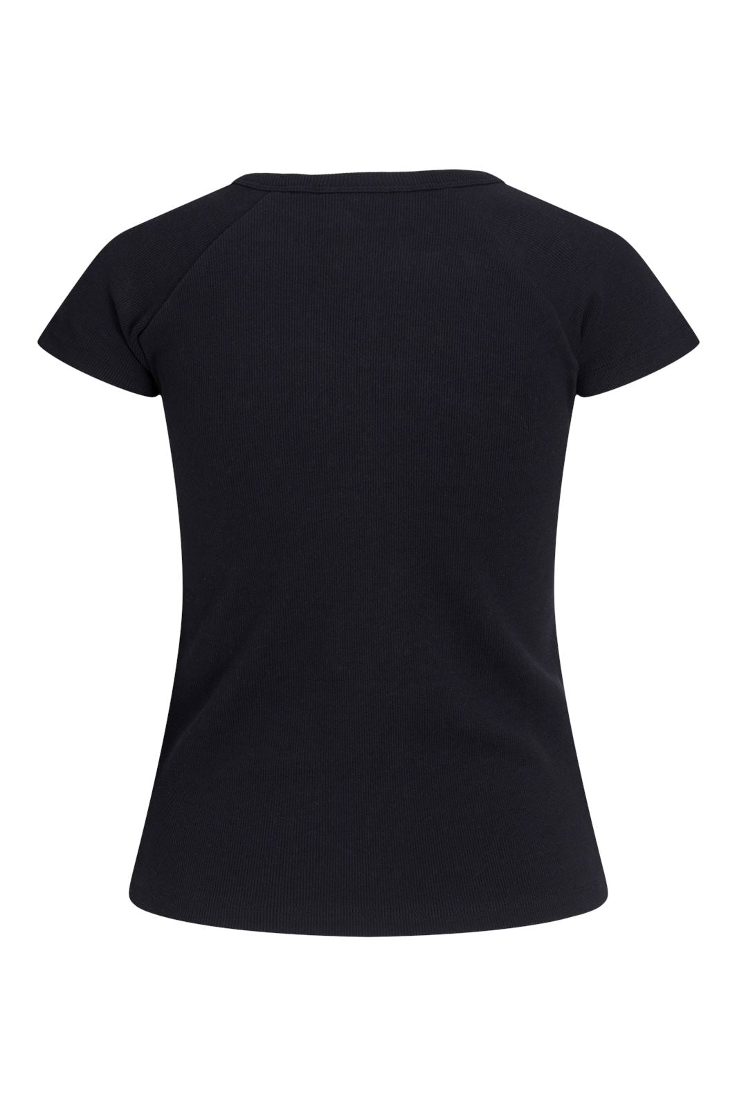 Zwarte t-shirt van Jjxx in ribbreisel met stretch-pasvorm. De t-shirt heeft een ronde halslijn en korte mouwen. De strakke pasvorm volgt de lijnen van het lichaam en biedt goede bewegingsvrijheid.