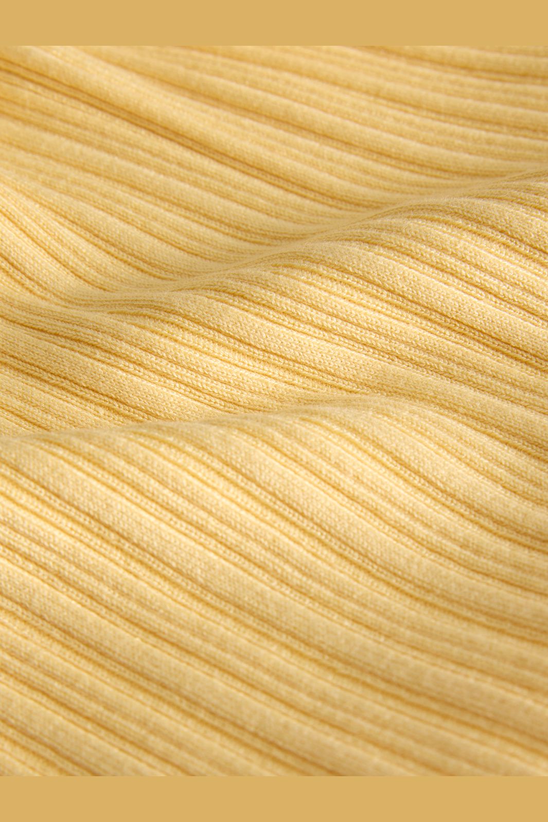 Een gele gebreide polotrui van Jjxx met ribbreisel en verticale banen. De polo heeft een aangesloten pasvorm en korte mouwen.
