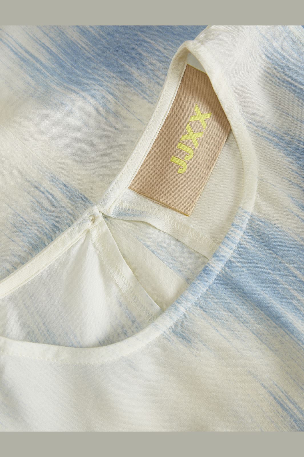 Mouwloze jurk van Jjxx met golvenpatroon in lichtblauwe en witte tinten. De jurk heeft een losse pasvorm en een ronde halslijn die goede bewegingsvrijheid biedt.