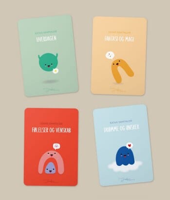 Gespreksspel van Josefine Valentin met kleurrijke kaarten voor kinderen. De blauwe doos bevat kaarten met verschillende thema's zoals fantasie, magie en het dagelijks leven, die de basis vormen voor leuke gesprekken.