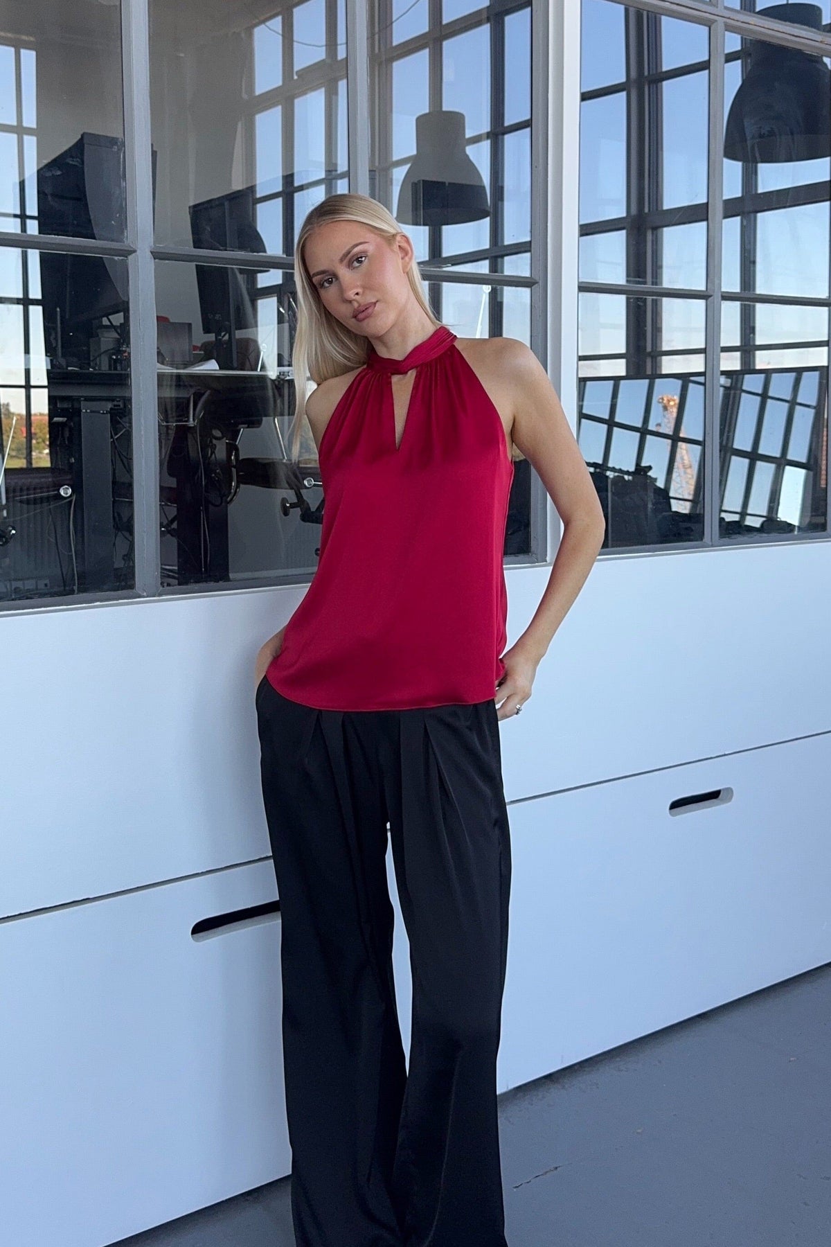 Rode top van Karmamia met een hoge hals en ruchesdetails. De top heeft een diepe V-hals en een striksluiting bij de hals. Je kunt 'm stylen met de Savannah-rok of een broek.