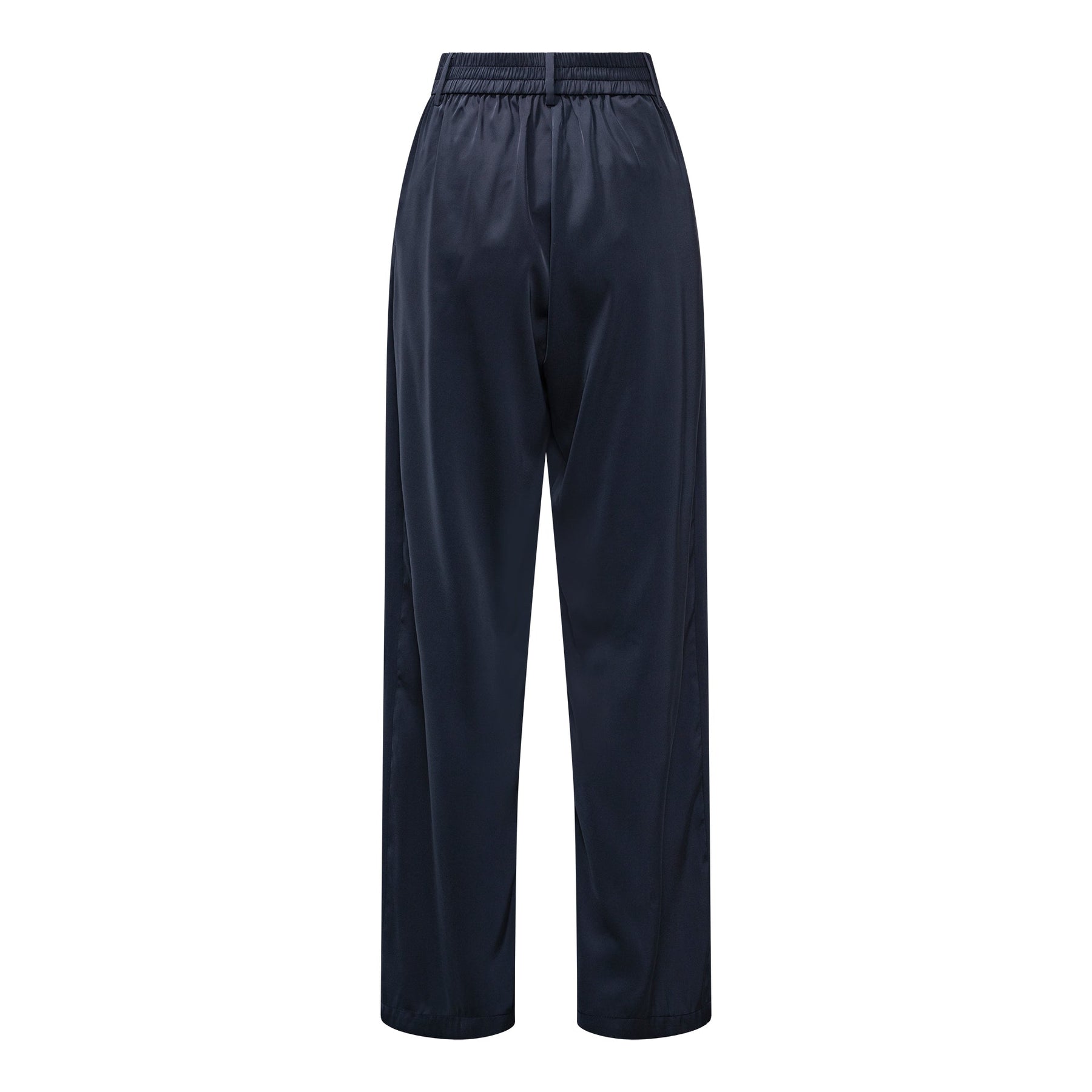 Donkerblauwe broek van Karmamia met een hoge taille en wijde pijpen. De broek is geschikt voor feestelijke, alledaagse en formele gelegenheden.