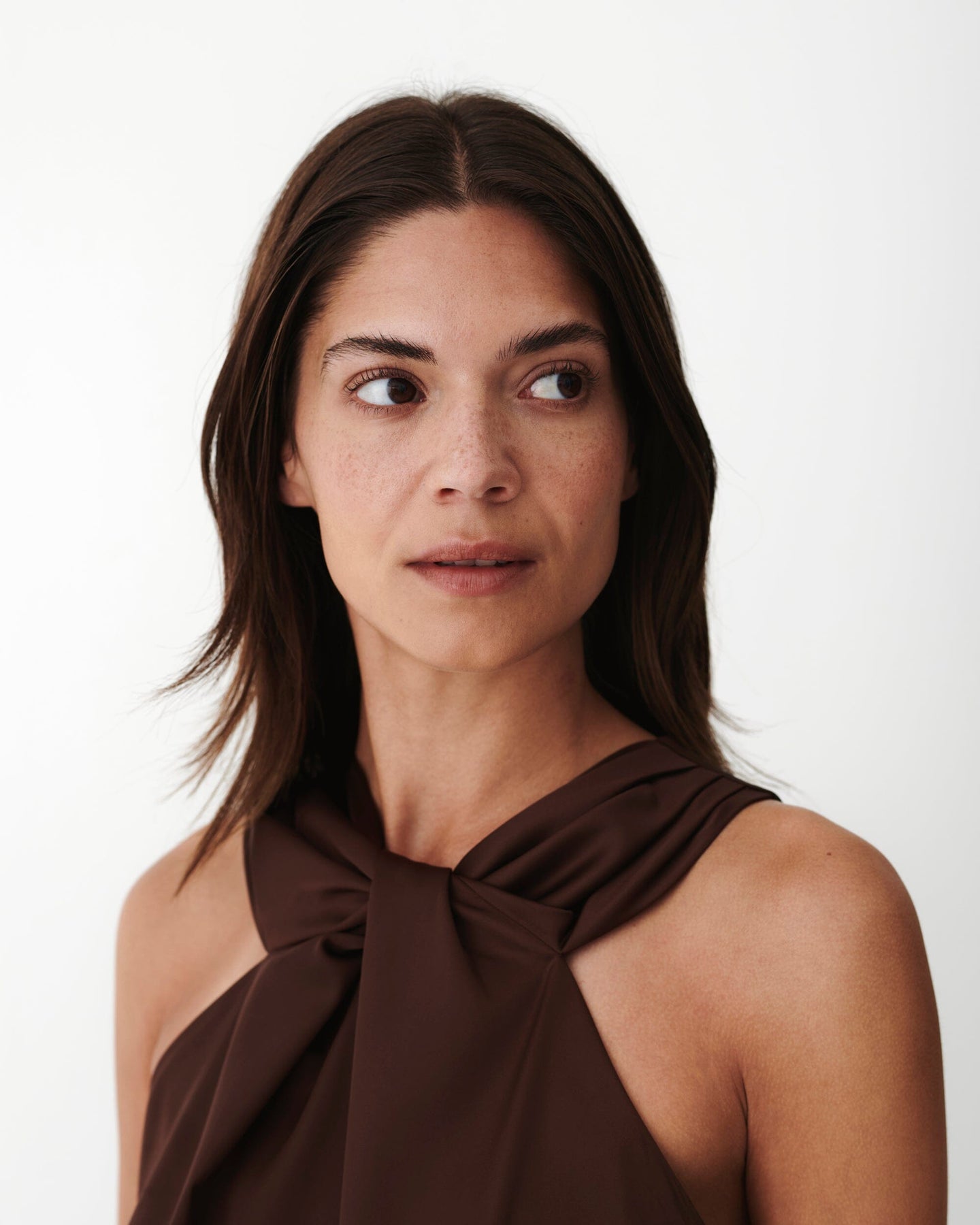 Bruine top van Karmamia met een hoge hals en knoopdetail. Het mouwloze model heeft een regular fit en sluit met knopen. De top is geschikt voor zowel formele als feestelijke gelegenheden.