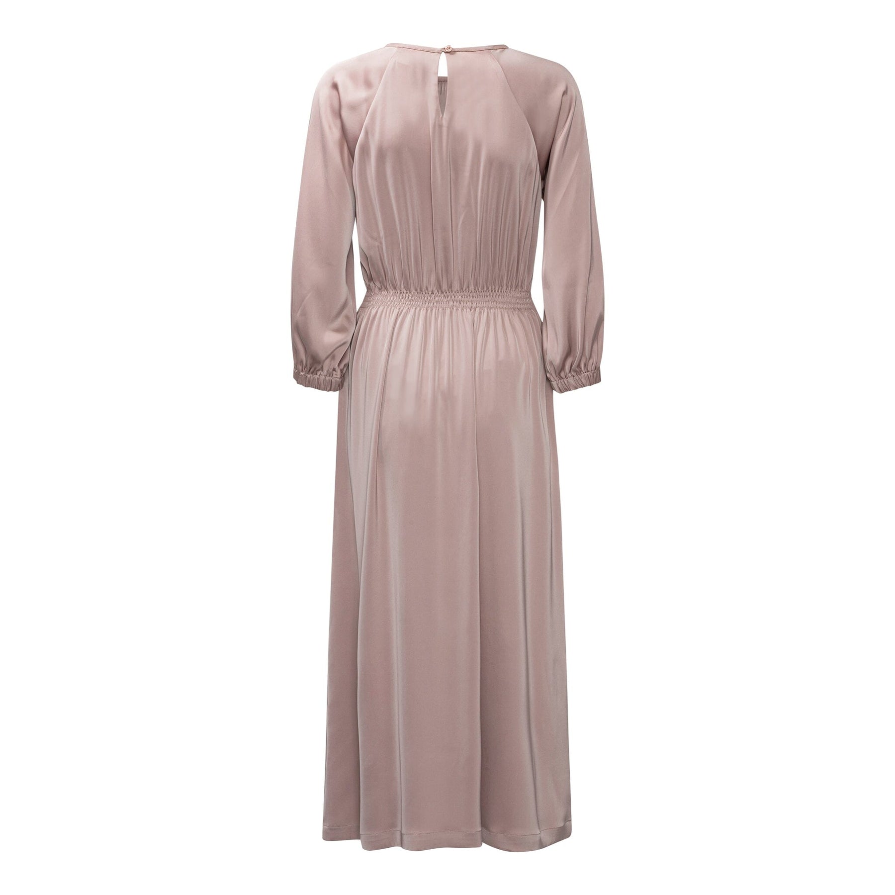 Roze jurk van Karmamia, gemaakt van satijn in een zachte rosétint. De jurk heeft een lengte tot halverwege de kuit en 3/4-mouwen.