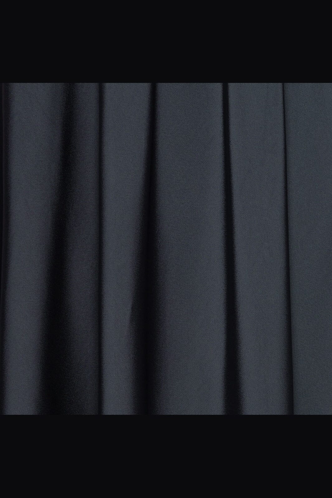 Donkerblauwe rok van Karmamia in glanzende satijn. Hij heeft een hoge taille met gerimpeld elastiek en valt losjes tot op de kuiten met zachte plooien.