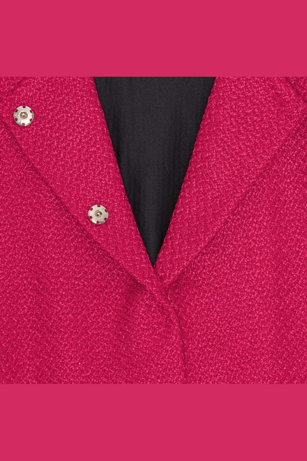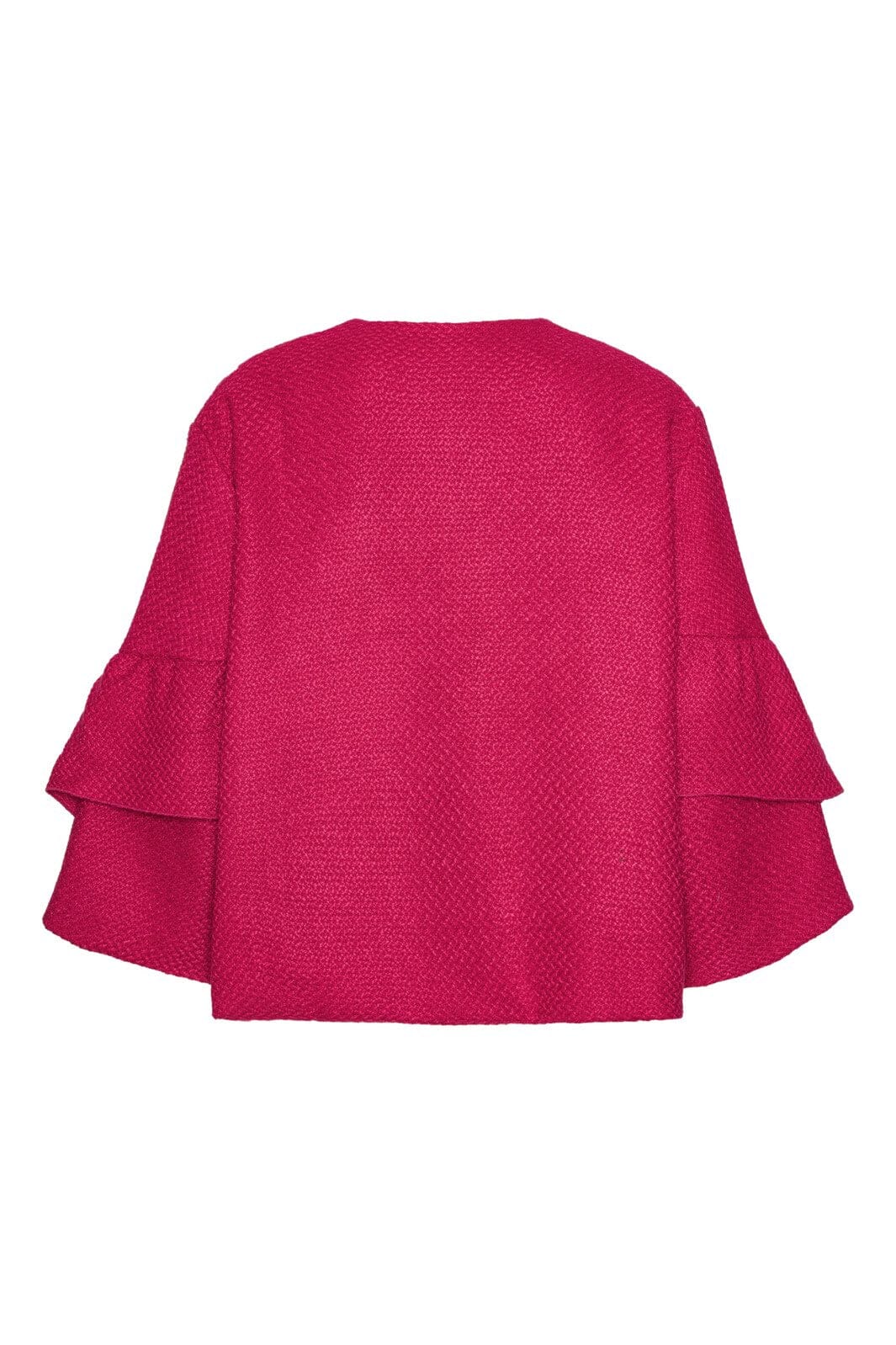 Roze jasje van Karmamia in een geweven stof met zwarte voering. Het jasje heeft brede mouwen met ruches en twee metalen knopen aan de voorkant. Het is onderdeel van een beperkte collectie.
