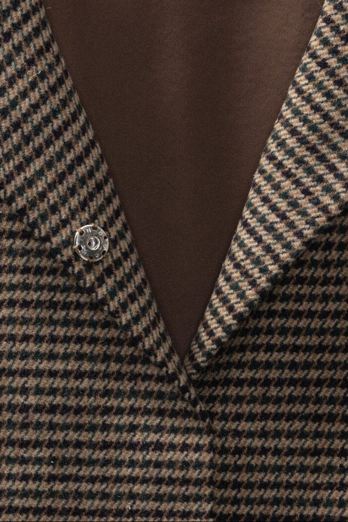 Jas van Karmamia met een geruit patroon in bruine en beige tinten. De buitenlaag is gemaakt van wol, terwijl de voering van zachte polyestersatijn is.