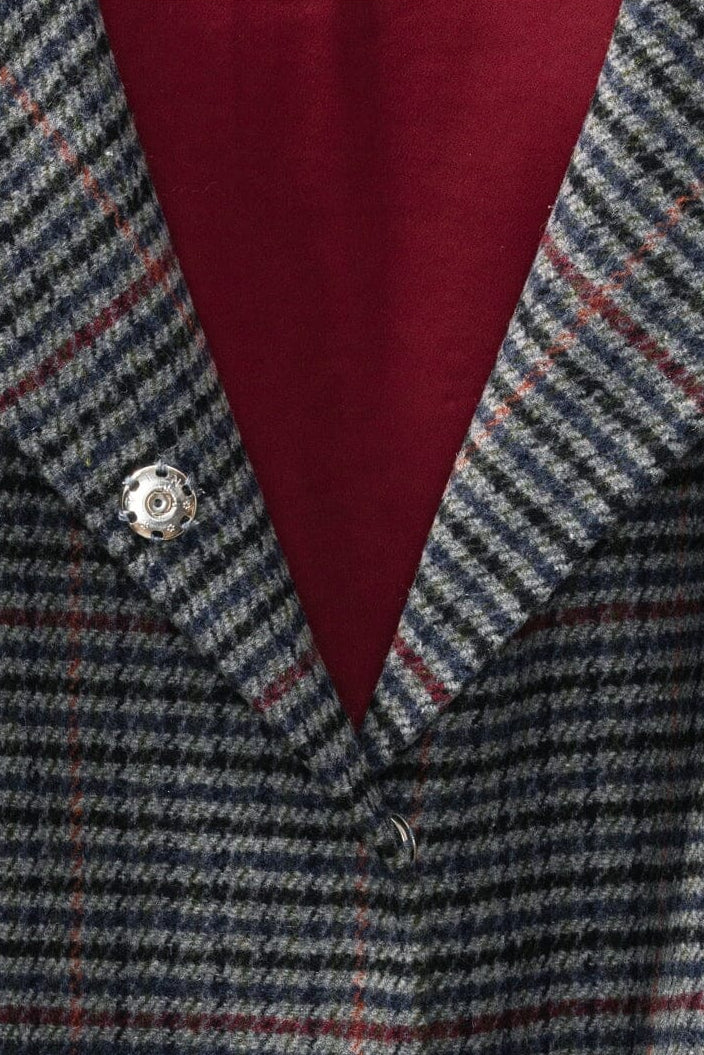 Spencer-jasje van Karmamia met een geruit patroon in zwart, grijs, rood, bordeaux en zilver. De jas heeft peplum-mouwen met gelaagde ruches en een rode voering.