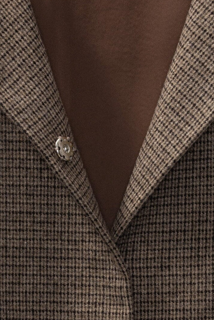Geruite jas van Karmamia in een bruine tint. De jas heeft peplum mouwen met gelaagde ruches en twee zichtbare metalen knopen bij de halslijn.