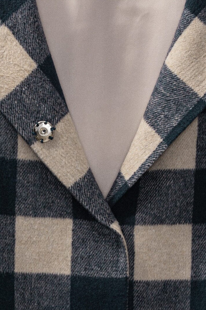 Spencerjasje van Karmamia met een geruit patroon in beige en donkerblauw. De jas heeft een V-hals en 3/4 mouwen met ruches.