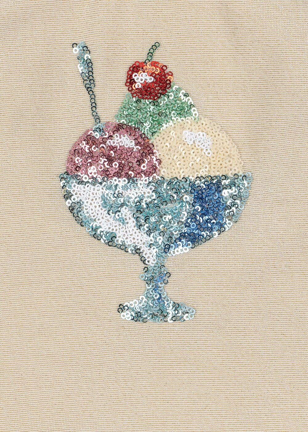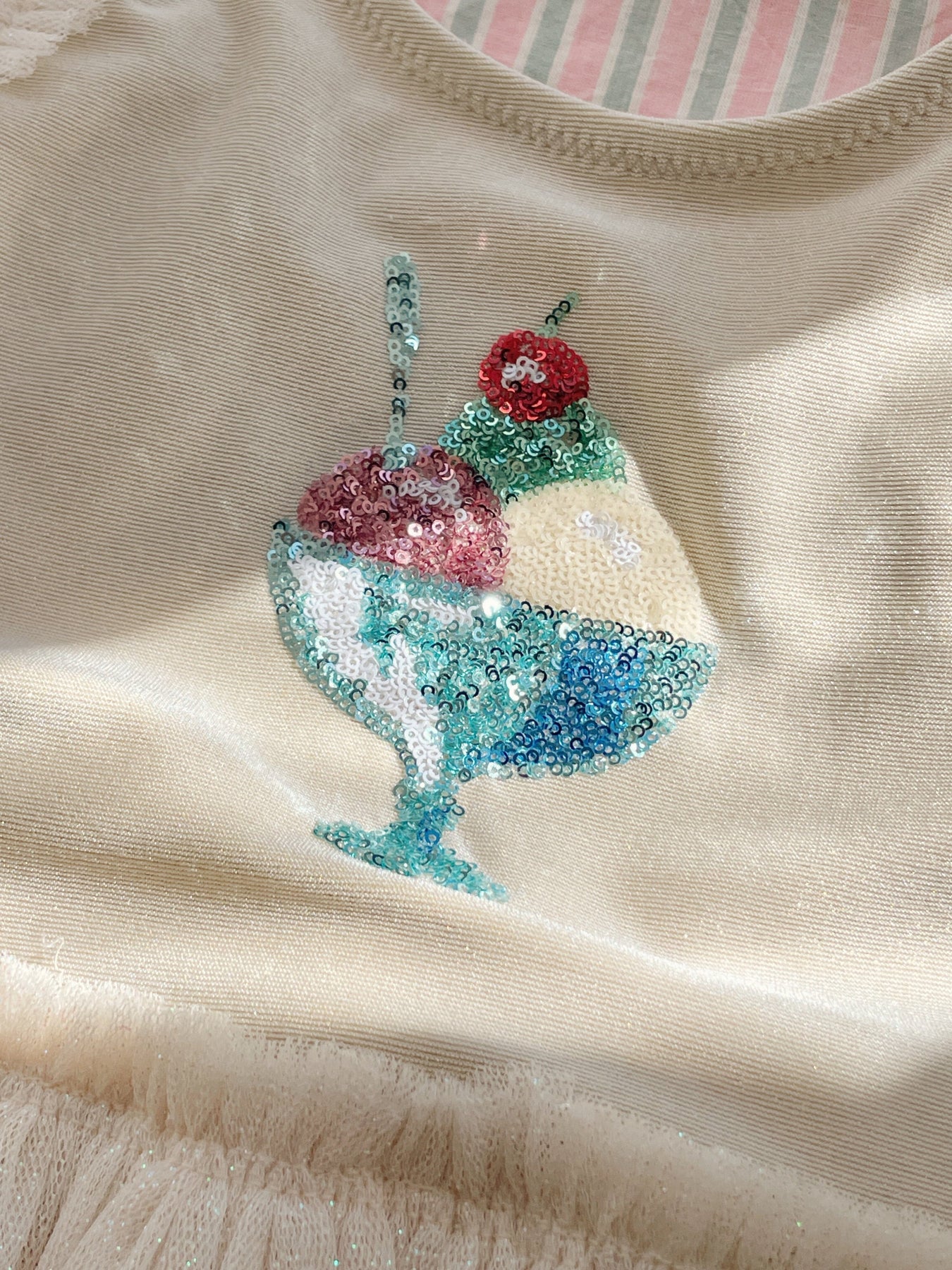 Badpak van Konges Sløjd in een zachte lichtroze tint met crèmekleurige en witte nuances. Het badpak heeft ruches, pailletten en plooien.