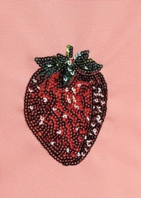 Thermo-lunchtas van Konges Sløjd in een roze rozetkleur. De tas heeft een aardbeienmotief van pailletten aan de voorkant.