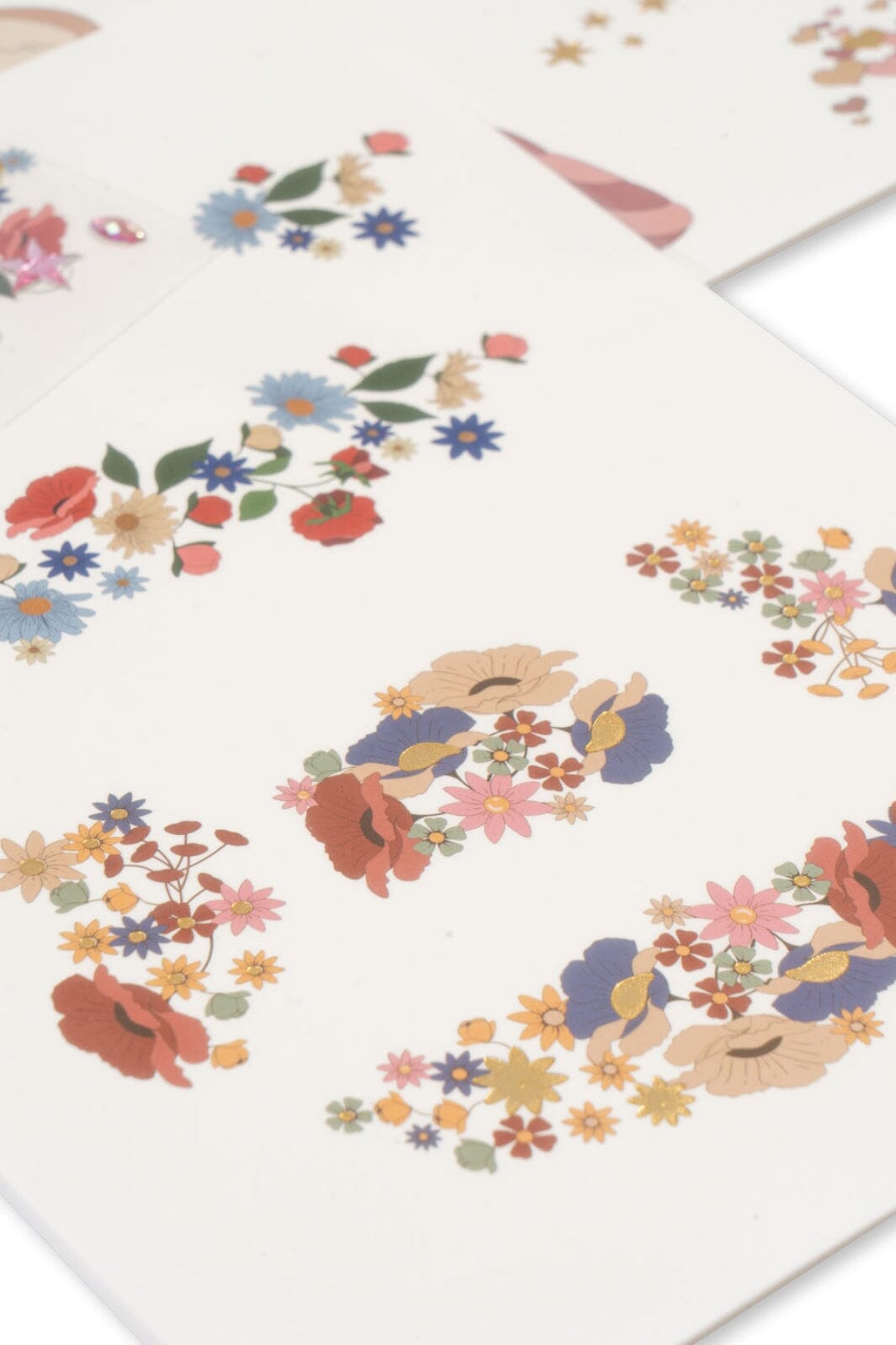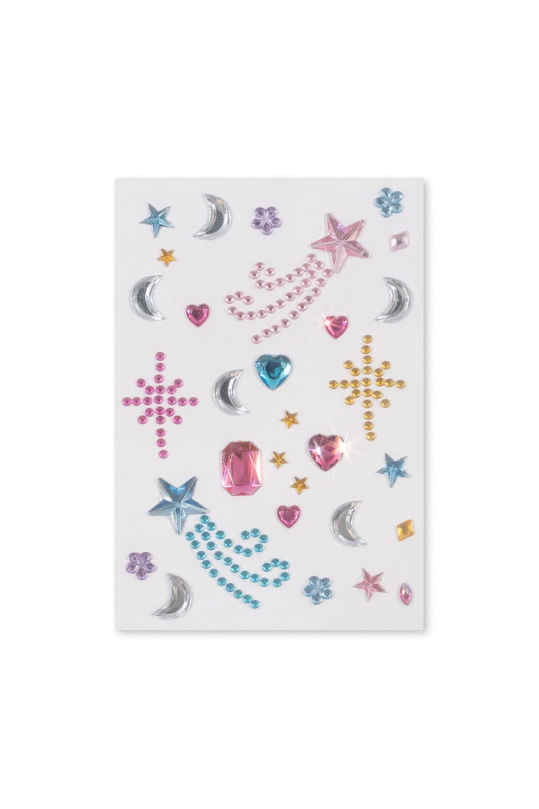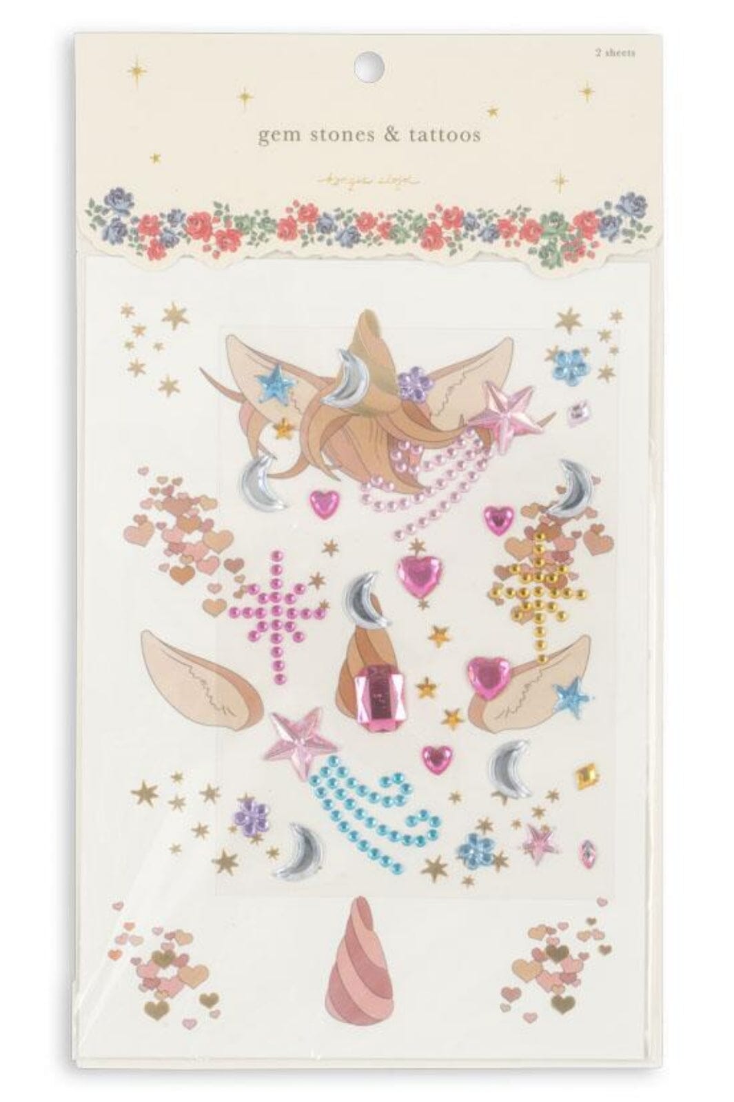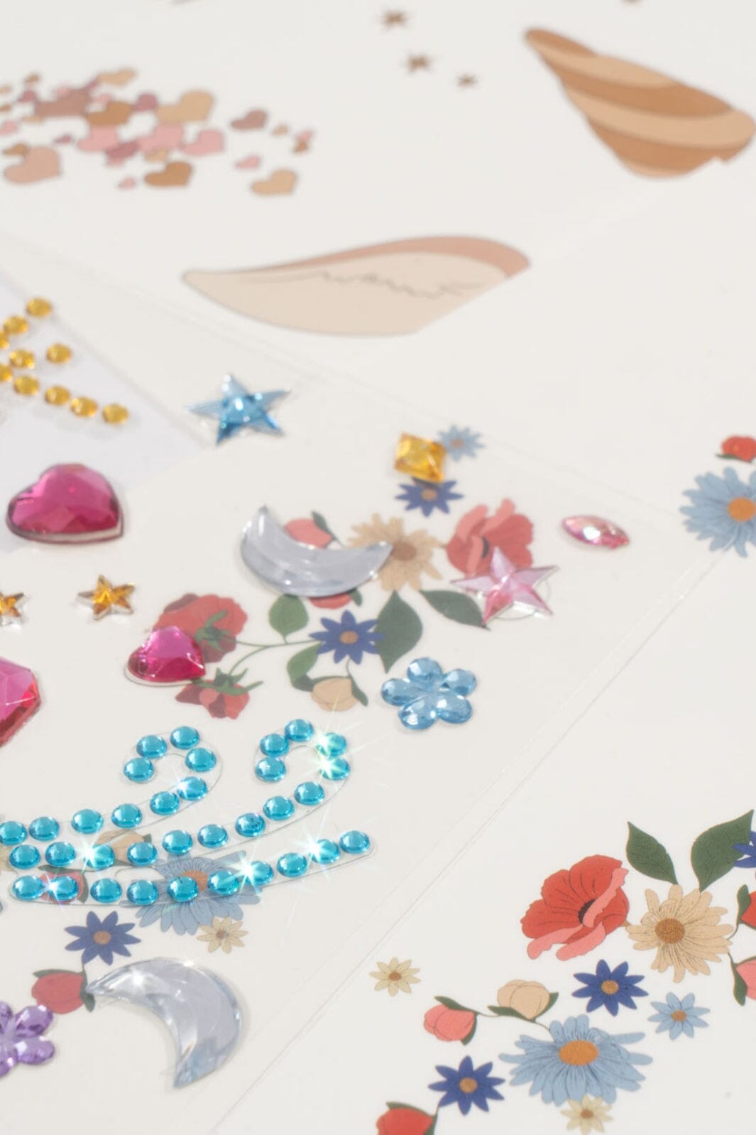 De verschillende motieven op de vellen omvatten glinsterende edelstenen en decoratieve tatoeages met bloemen en sterren voor creatief spel.