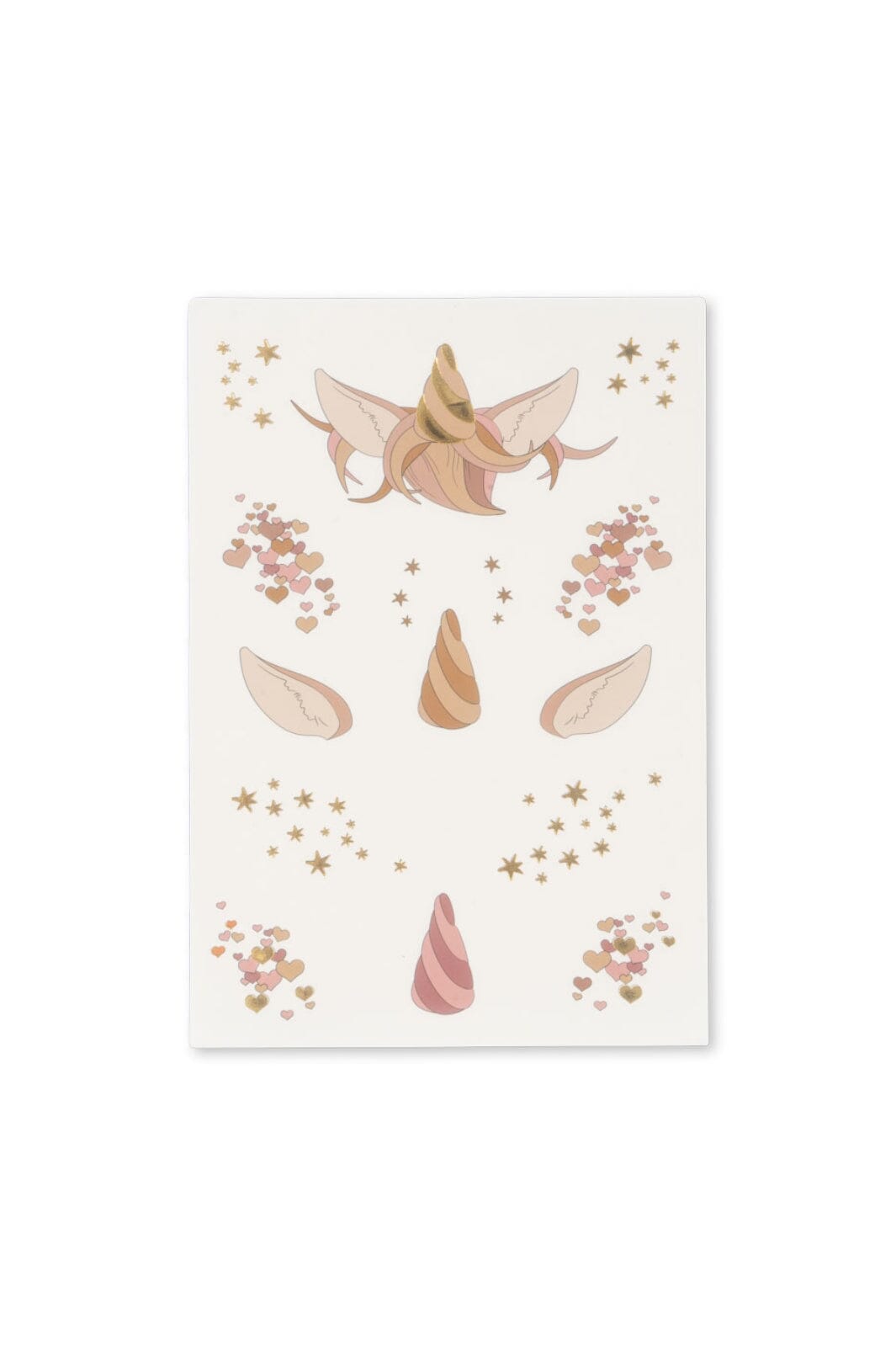 Twee vellen met stickers en tatoeages van Konges Sløjd. De vellen bevatten sterren, harten, manen en bloemen in roze, blauw, goud en zilver.