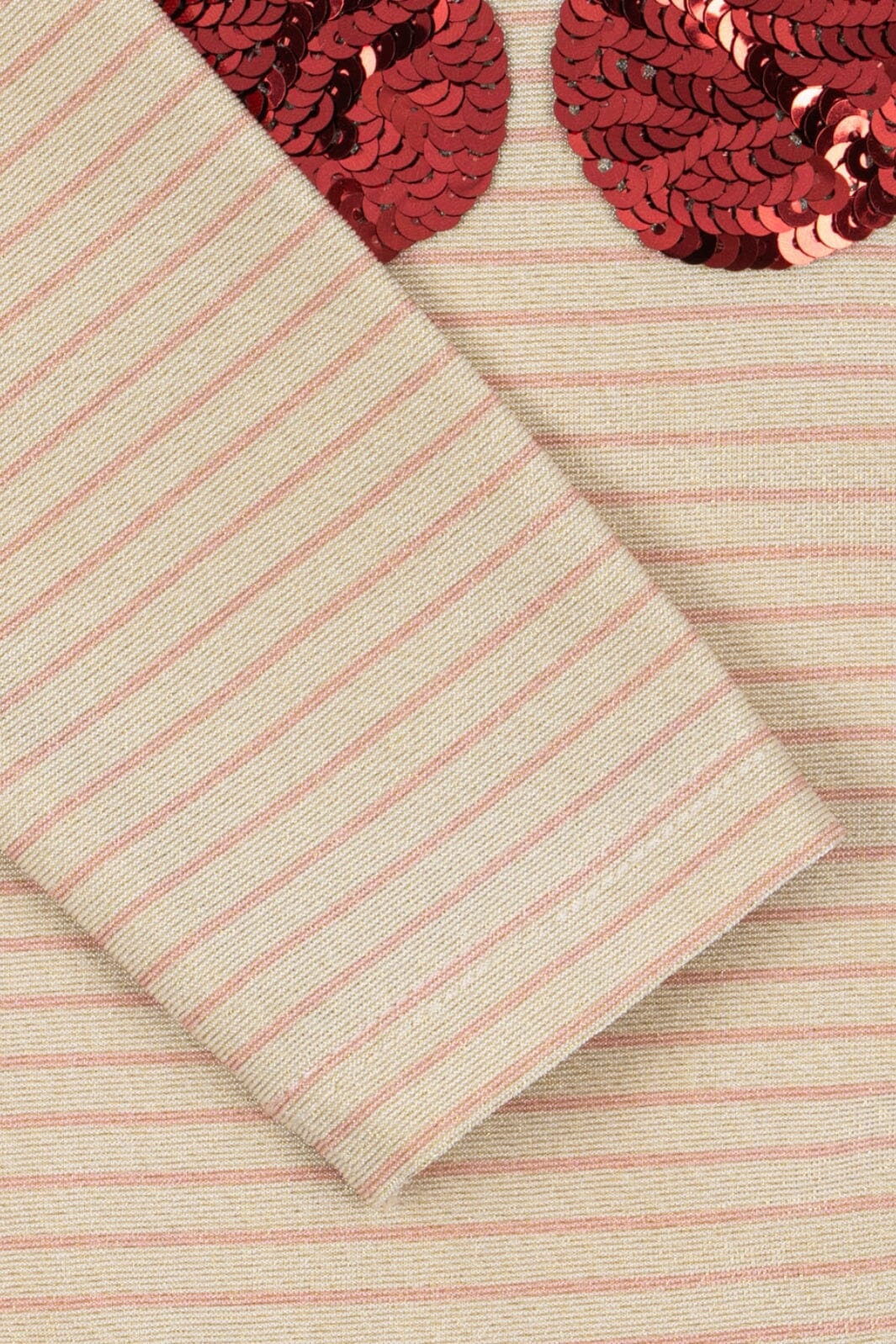 Langärmig badpak van Konges Sløjd met een streeppatroon in roze en beige tinten. De lange mouwen bieden zonbescherming en de kersenpailletten aan de voorkant maken hem leuk om te dragen.