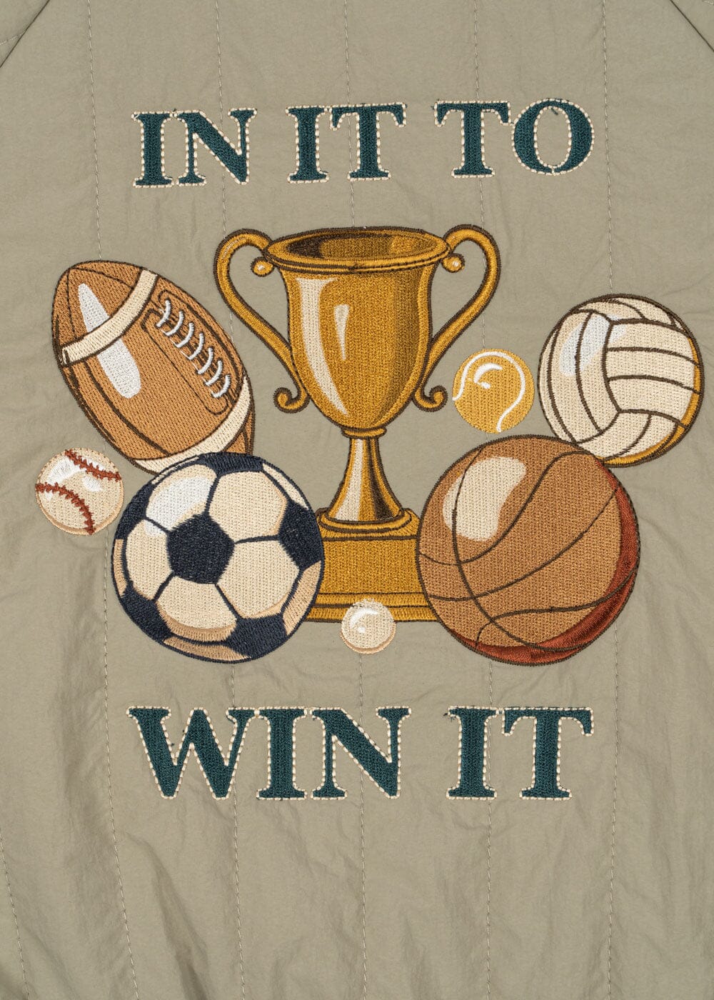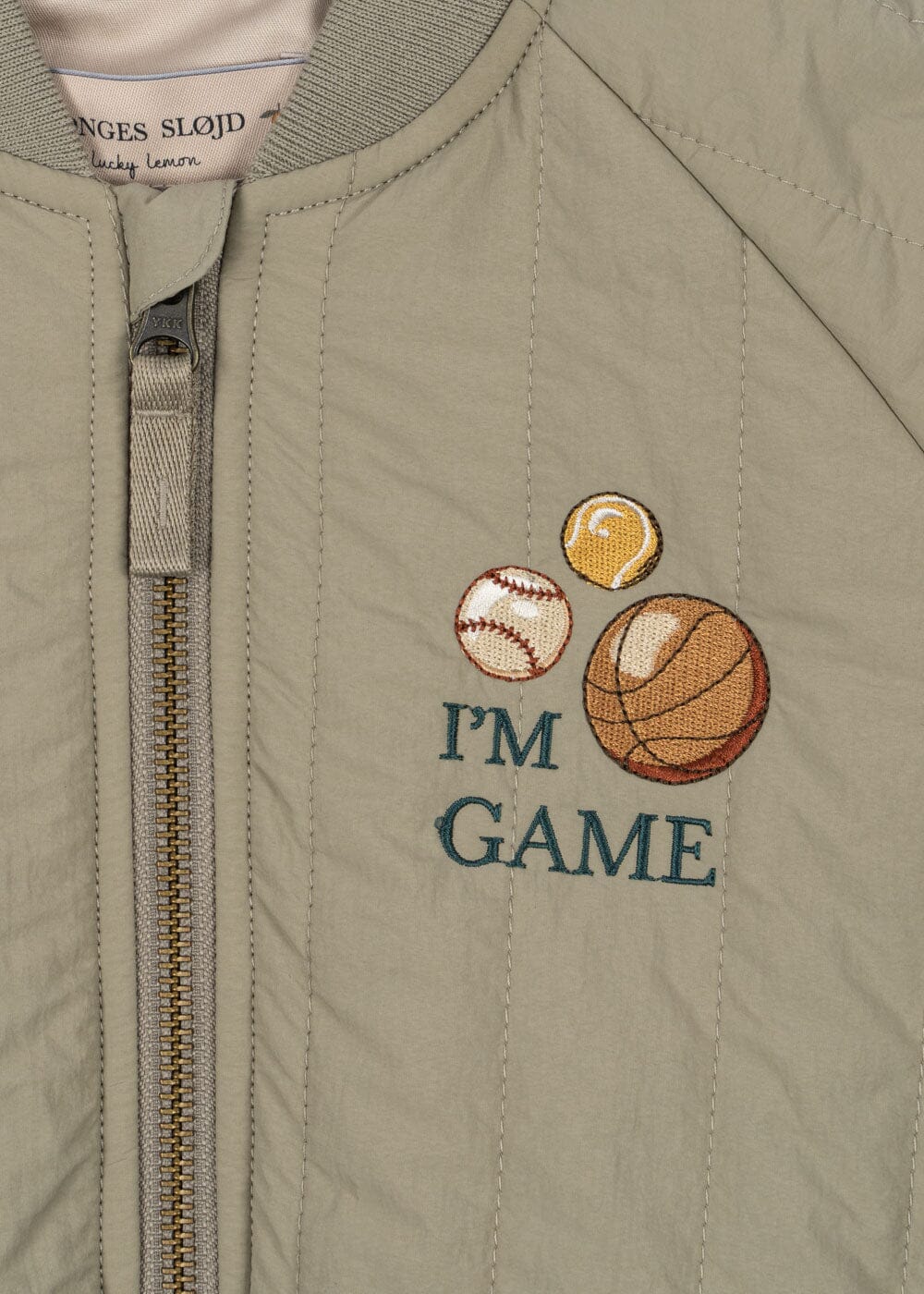 Bomberjack van Konges Sløjd in kaki groen met meerkleurige details. Het jack heeft borduursel en decoratieve stiksels aan de buitenkant.