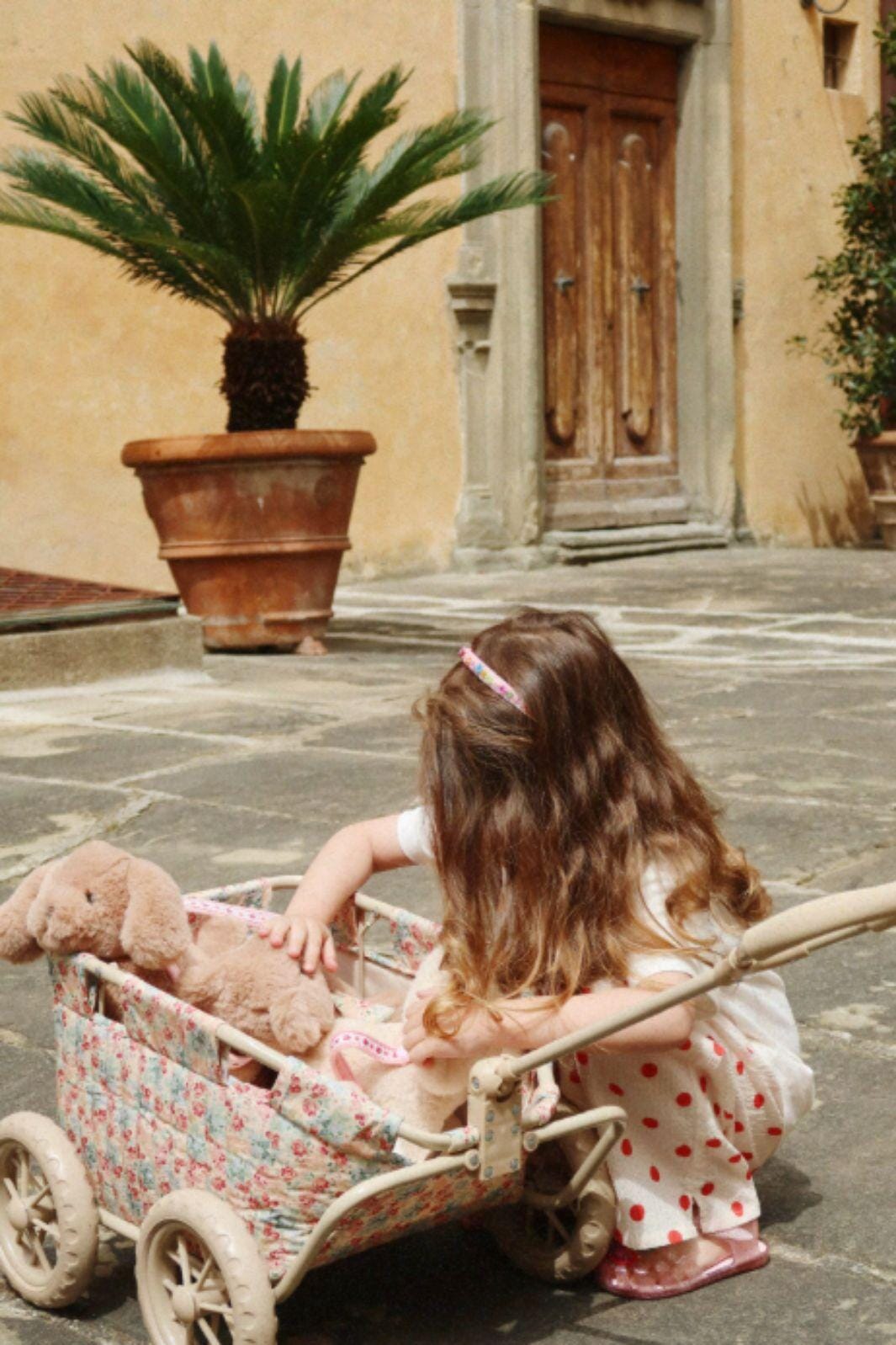 Een bolderkar van Konges Sløjd met beige stof en lichtroze bloemmotief. Het frame is van ijzer en de wielen zijn grote EVA-wielen voor buitengebruik.