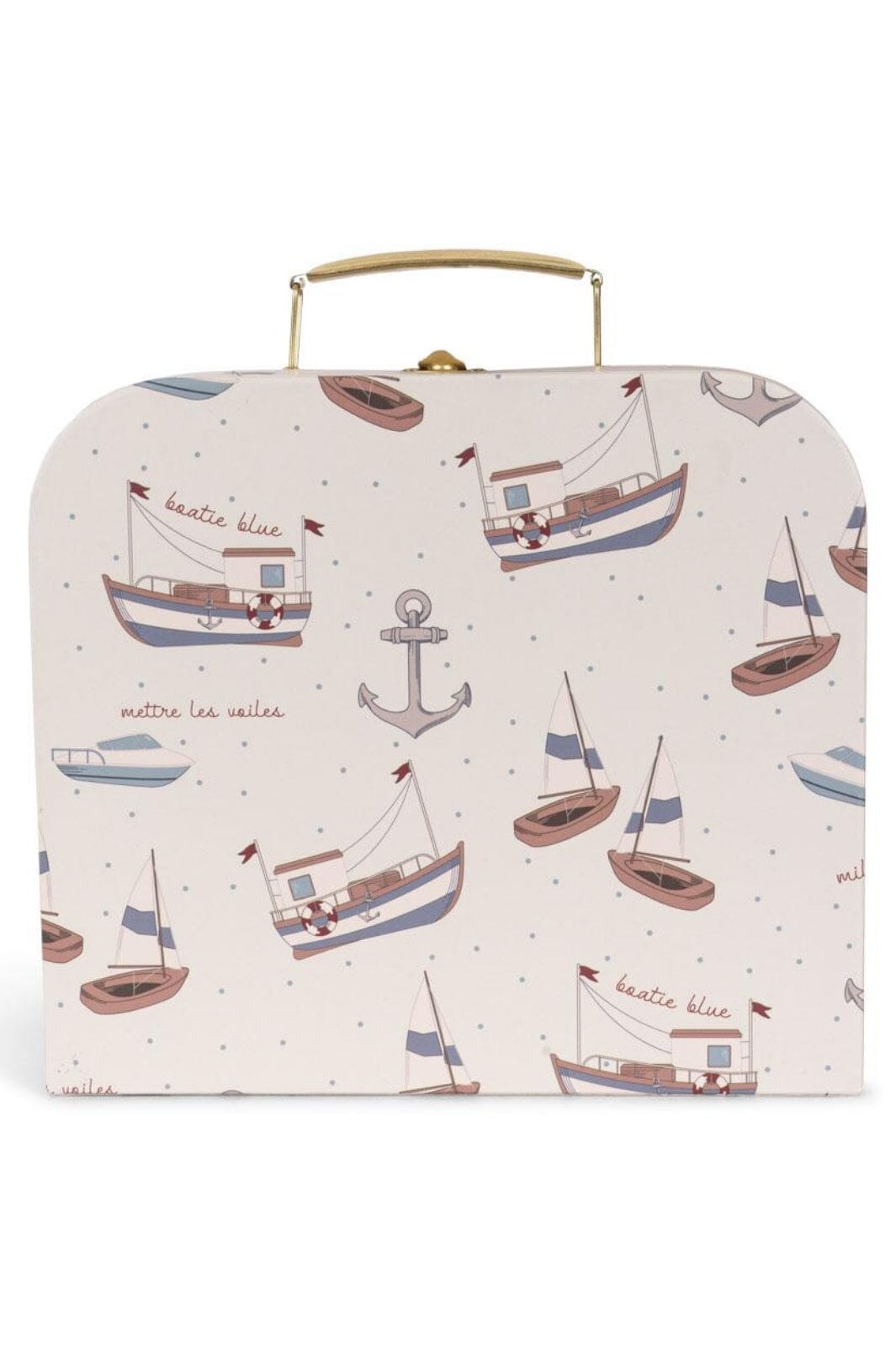 Een creatief set van Konges Sløjd met maritieme motieven. Het bevat notitieboekjes en kleurrijke stiften in een tas met boot- en ankermotief in lichtblauwe en crèmekleurige tinten.