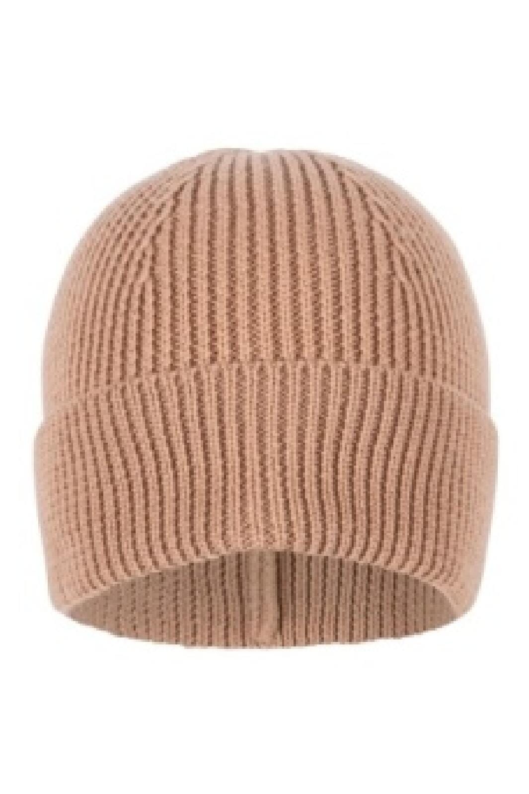 Gebreide muts van Konges Sløjd in een lichtbruine kleur. De muts heeft een geribbelde structuur en een omgeslagen rand die zorgt voor een goede pasvorm.