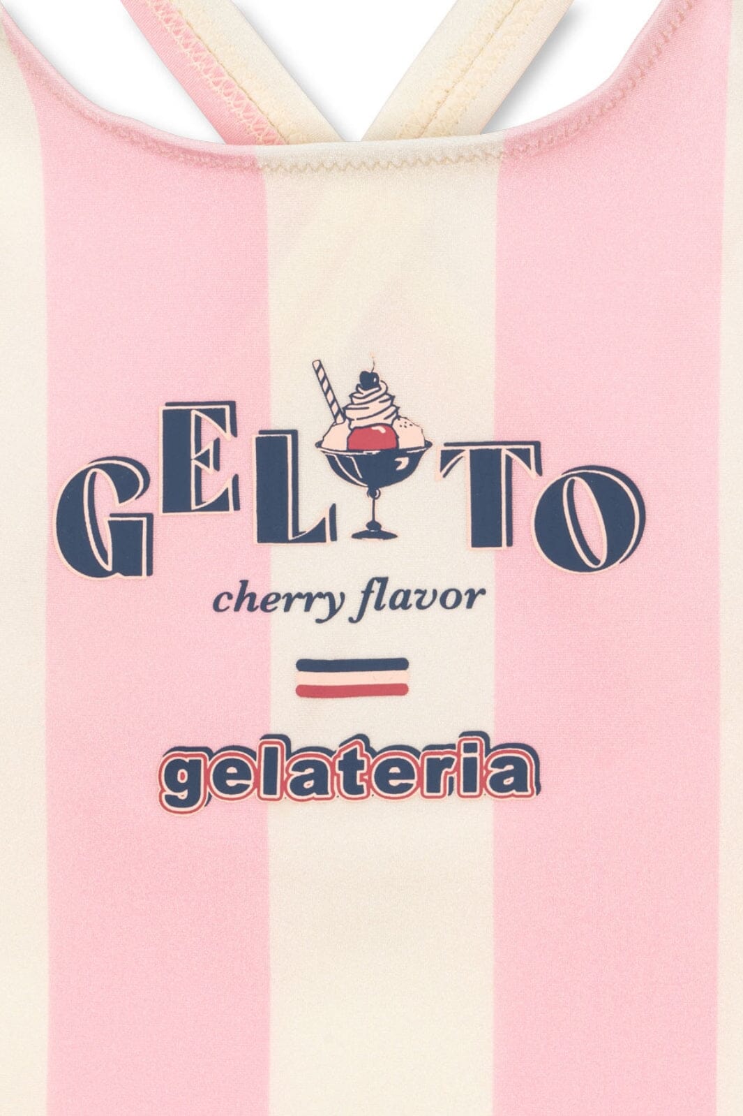 Roze-wit gestreept badpak van Konges Sløjd met gelato-print aan de voorkant. Mouwloos design met ronde halslijn.