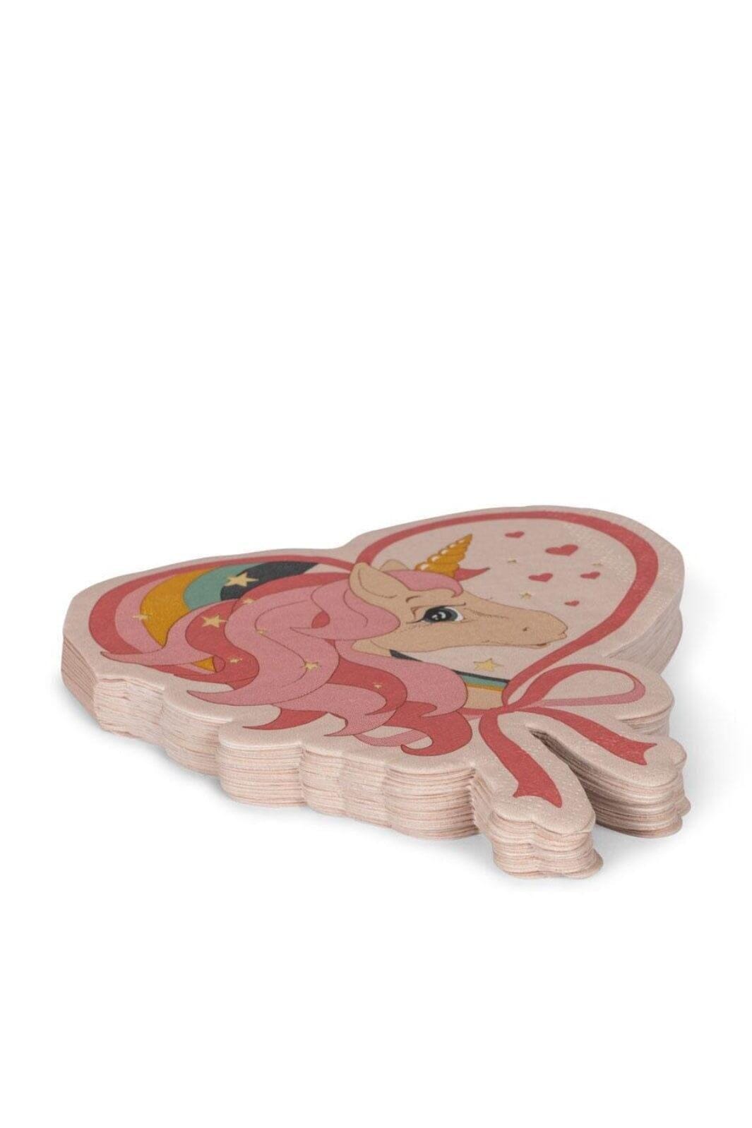 Papierservetten van Konges Sløjd in een eenhoornvorm. De servetten hebben een kleurrijke print met een roze eenhoorn, gouden hoorn, harten en sterren op een lichte achtergrond.