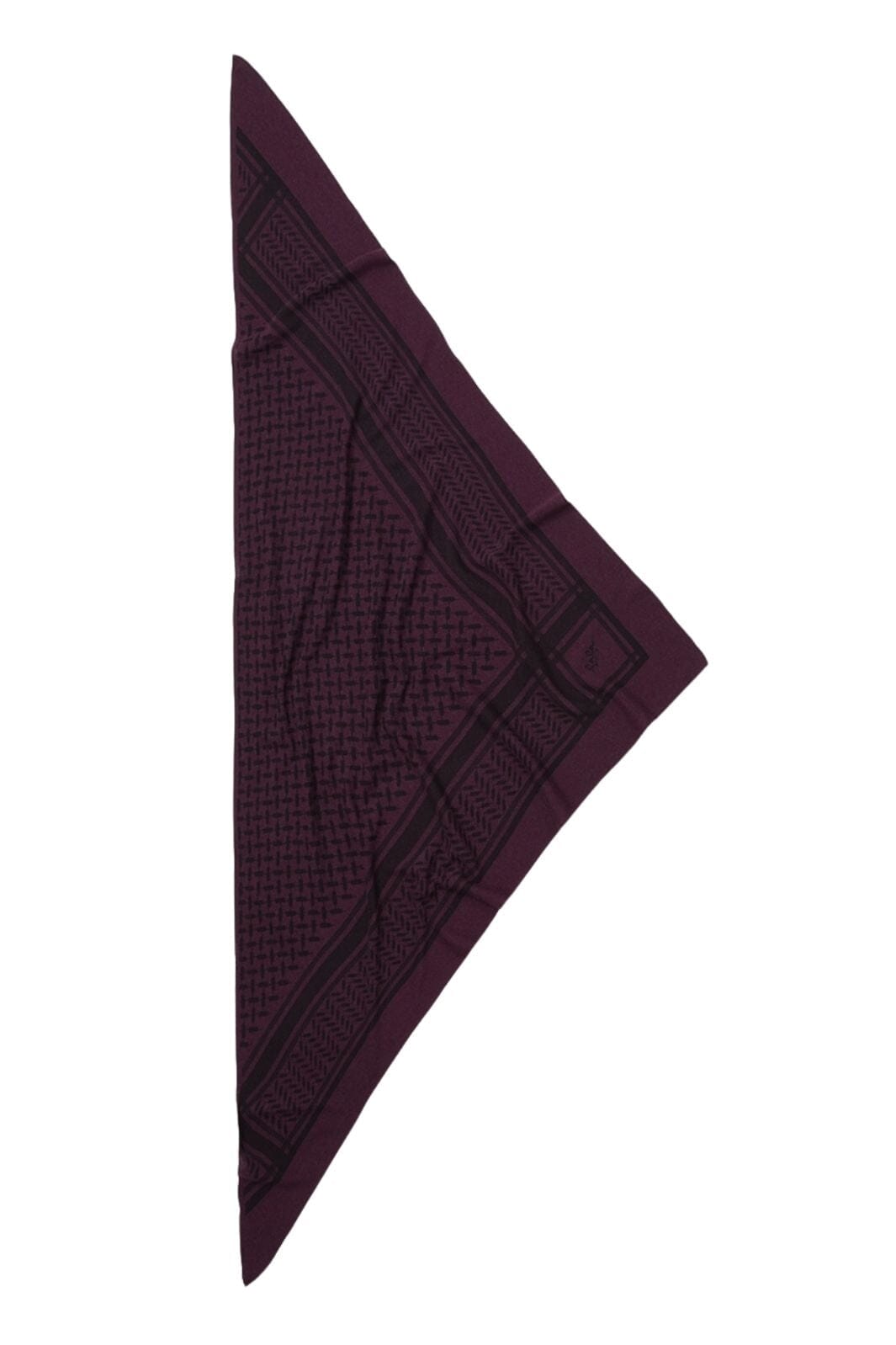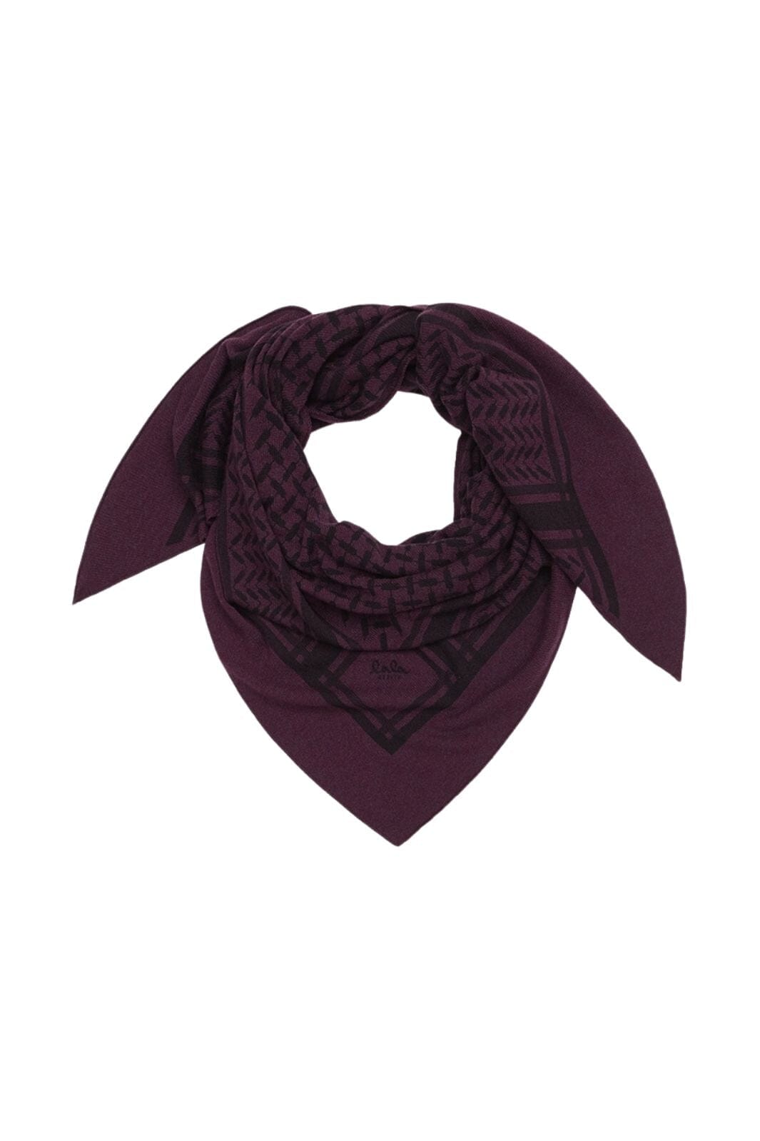 Driedhoekige sjaal van Lala Berlin in kasjmier met visgraatpatroon en print. De diepe bordeauxkleur met zwarte details creëert een opvallend ontwerp met grafische patronen.